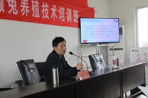 2014年10月23日国家兔产业技术体系岗位专家、我院吴信生教授在灌南县为该县基层畜牧兽医技术人员和养兔场(户)讲授了家兔遗传育种技术,并现场进行了技术指导。