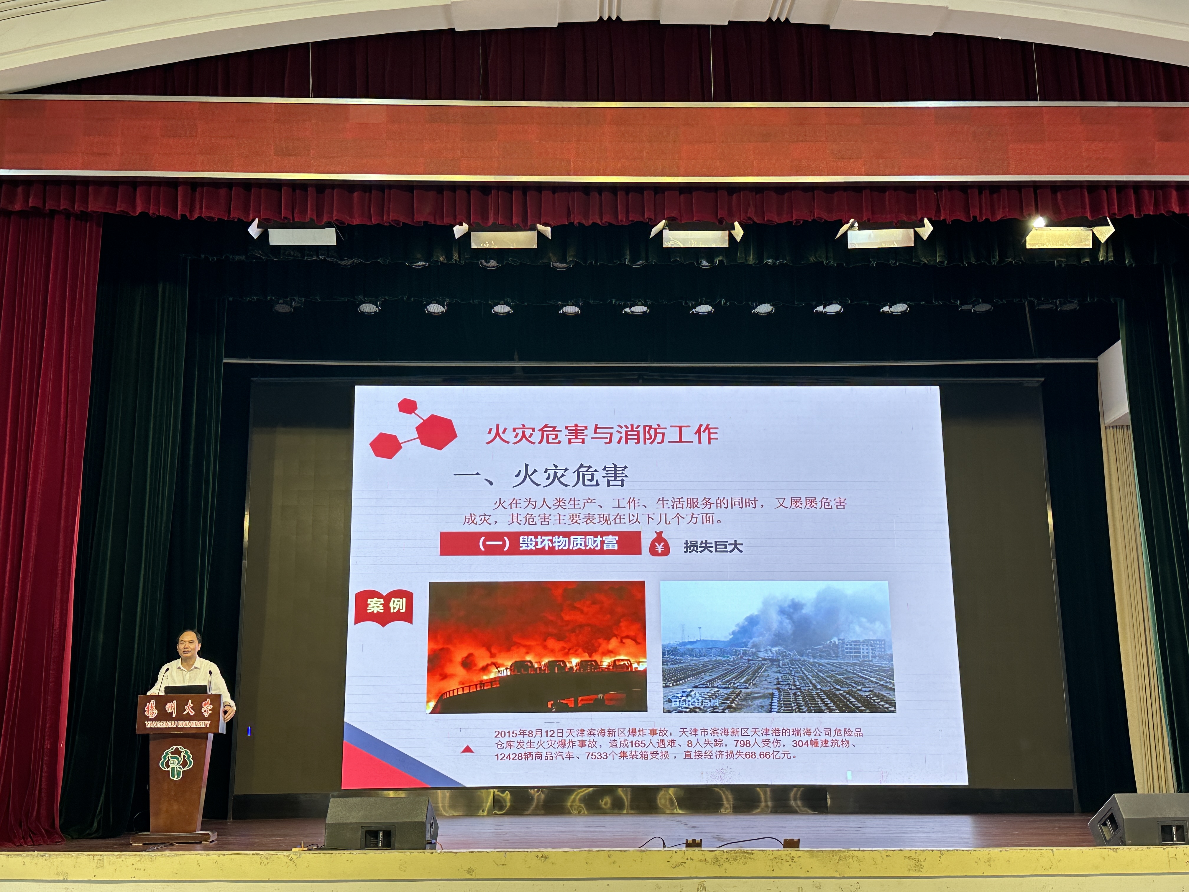 中午13点整,学院召开全院学生大会,高红明从应急管理基本知识、情景构建的应急预案、贴近实战的应急演练三个方面向同学们系统介绍消防知识,讲解消防逃生知识和技能。13时50分,随着火灾警报声响起,应急演练实操正式开始。同学们在工作人员的疏散下纷纷双手抱住头部,身体微弯前倾,戴好口罩,按照楼层消防通道和安全疏散指示牌进行快速有序撤离。到达指定安全地集结后,工作人员立即清点人数,检查有无受伤人员,及时汇报疏散撤离情况,参与本次演练的学生在短时间内全部安全逃离大楼。