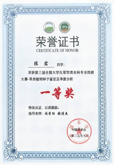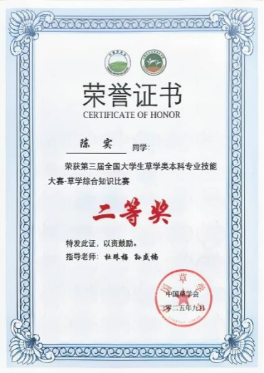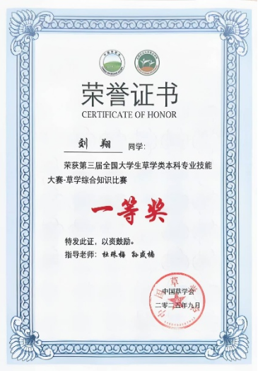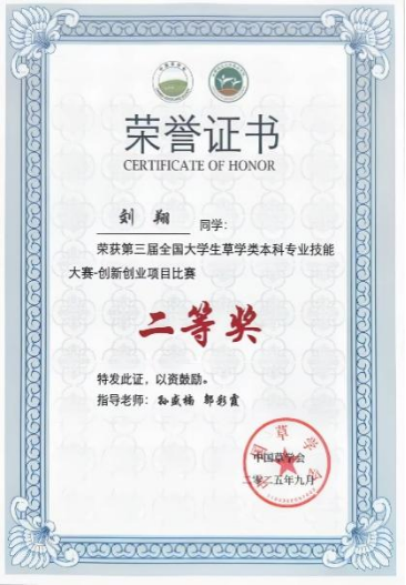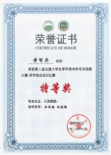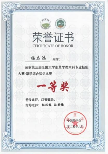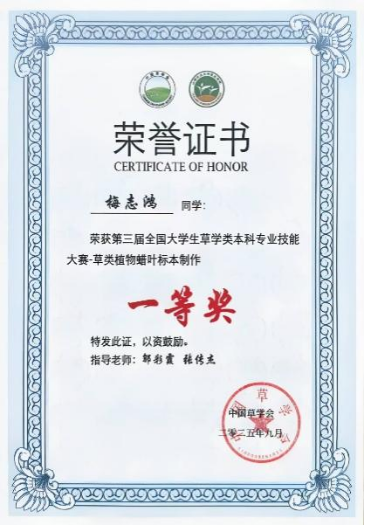 此外,草业2301班黄智奕获得草学综合知识比赛个人特等奖,刘翔和梅志鸿获得草学综合知识比赛个人一等奖,陈实获得草学综合知识竞赛个人二等奖;草业2301班陈实获得草类植物种子鉴定及净度分析一等奖;草业2301班梅志鸿获得草类植物蜡叶标本制作一等奖;草业2301班刘翔获得创新创业项目二等奖。