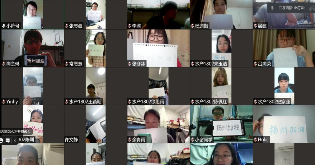 班会的最后,同学们打开视频,持笔写下“扬州加油”四字,进行合影留念。班级同学还制作了为扬州加油的暖心小视频。视频中,班主任老师与同学们纷纷用家乡话道出了“扬州加油”,简短的视频中流露出了大家对扬州战胜疫情之日到来的期待与信心,洋溢着暖暖的心意。疫情冰冷,温情尚存,你我同在。