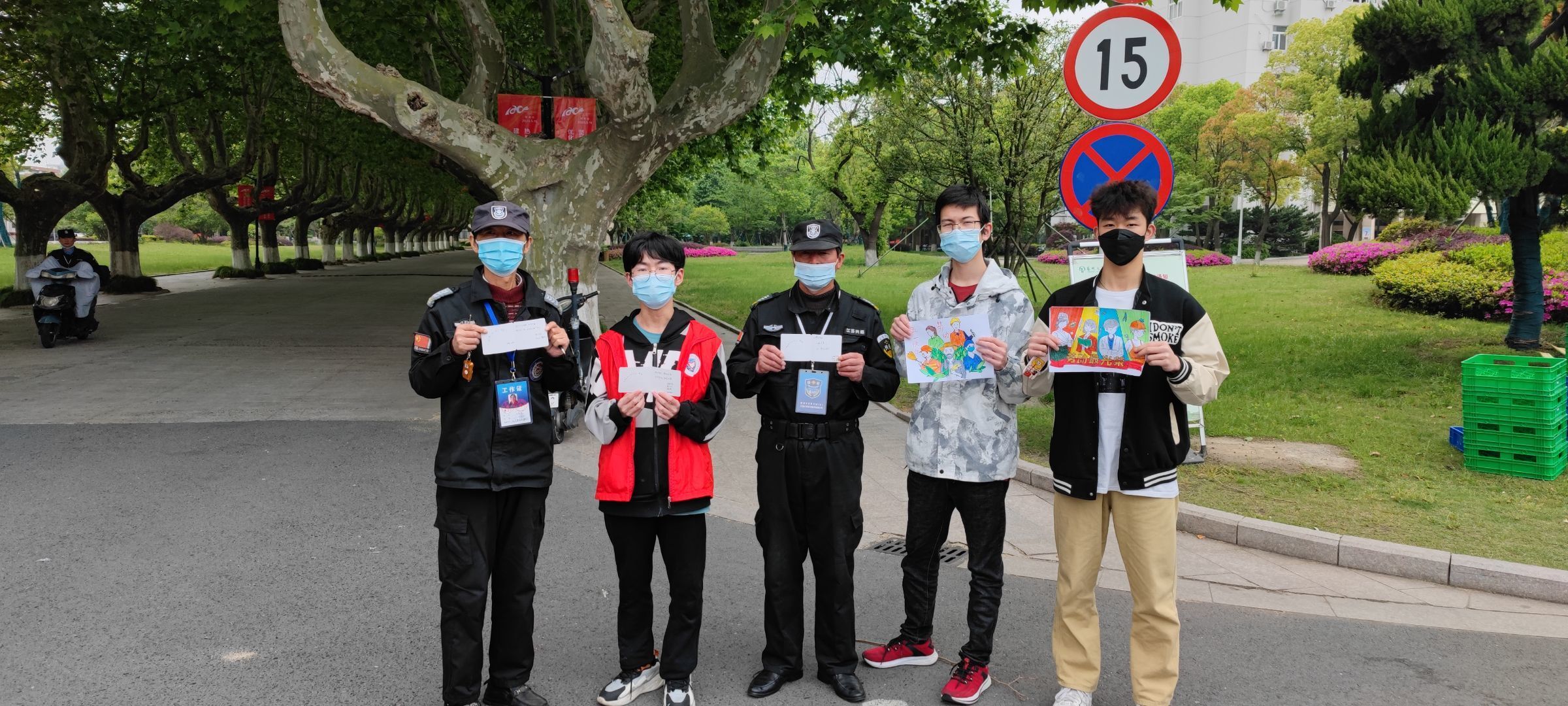在文汇路校区操场门口,学生在志愿者提供的卡片上书写自己的感谢与祝福的话语,并在卡片上注明自己的个人信息和赠送对象,有的同学还将自己的祝福绘成一幅画,“在您眼中,每个学生都是永远长不大的孩子,在生活上无微不至地照顾,您如妈妈一样亲切”“在疫情防控这场没有硝烟的战争中,如果说宿舍管理是‘后方’,那保卫处一定就是‘前线’,谢谢您”“谢谢您在我生病期间为我制作的病号餐,您日复一日,坚守在每个夜晚,也期待着每个清晨”“要让爱在每一个岗位之中释放温暖,让我们的生活变得更加有意义,让感恩成为习惯,让花儿永远盛开”……随后,学生制作的卡片和绘画由志愿者协助统一送出。