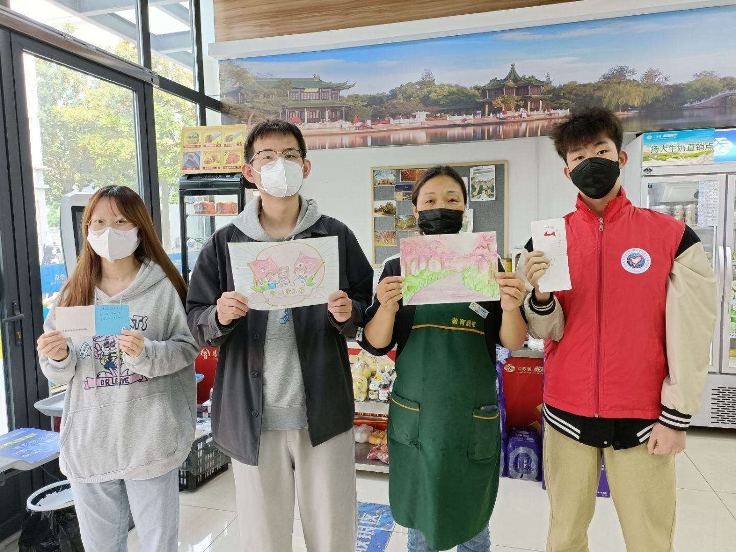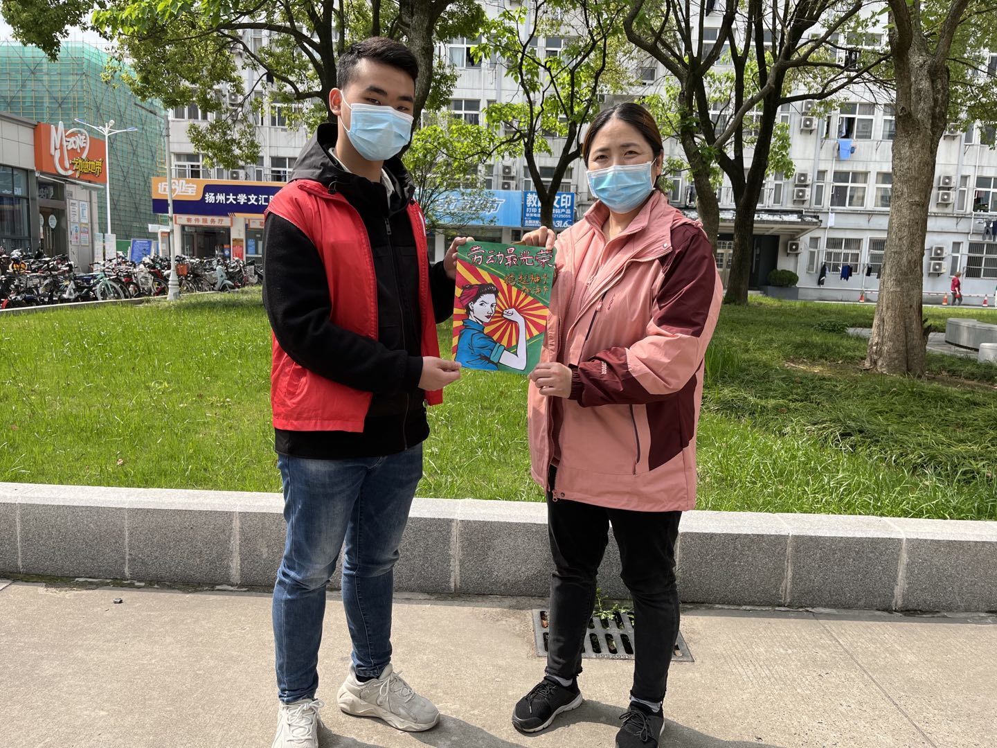4月30日,在扬州大学文汇路校区的校园内,该校动物科学与技术学院的志愿者通过原创绘画、手写明信片等的形式,向疫情期间为学生提供优质服务的后勤劳动者致敬。
