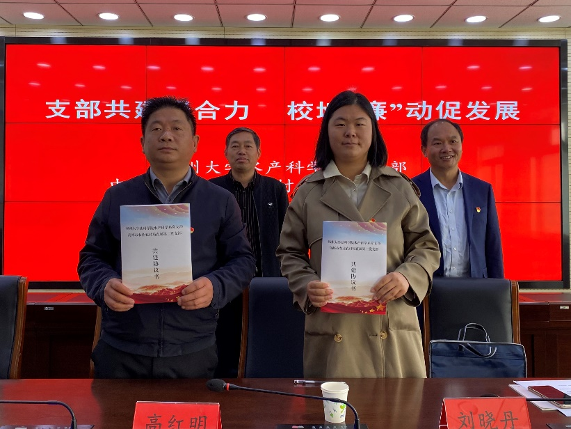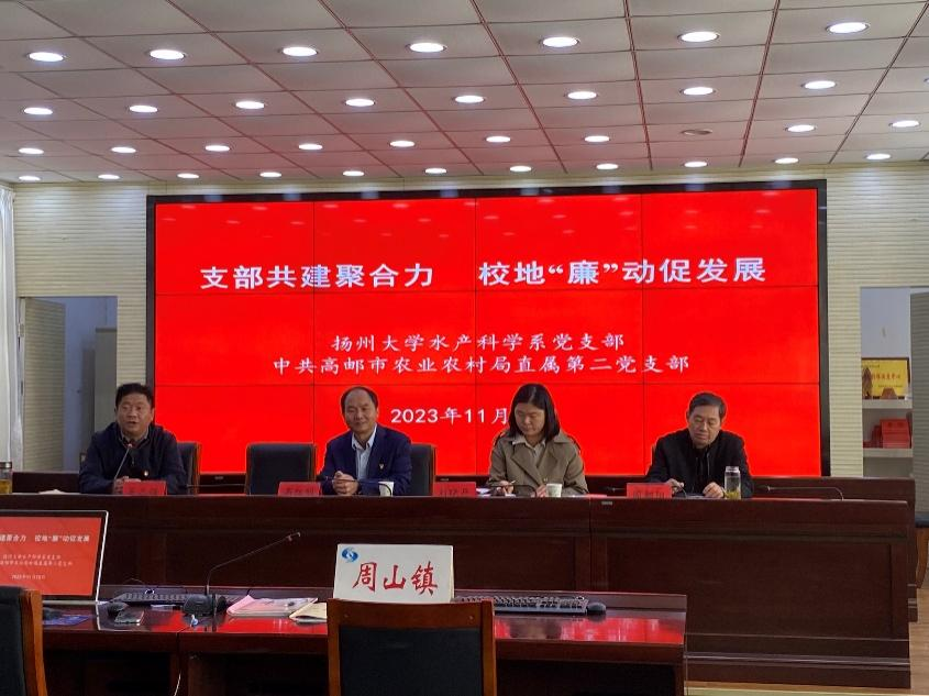 最后,大家前往周山镇指挥调度中心进行了交流研讨。我校水产科学系教师党支部与中共高邮市农业农村局直属第二党支部签订了支部共建协议。在交流中,高红明代表水产科学系党支部介绍了近年来在教学、科研和服务地方经济发展方面取得的成绩,并表示愿以此次支部共建为契机,加强与高邮市农业农村局直属第二党支部的联动,促进科研成果就地转化,将论文写在高邮的水面之上。
