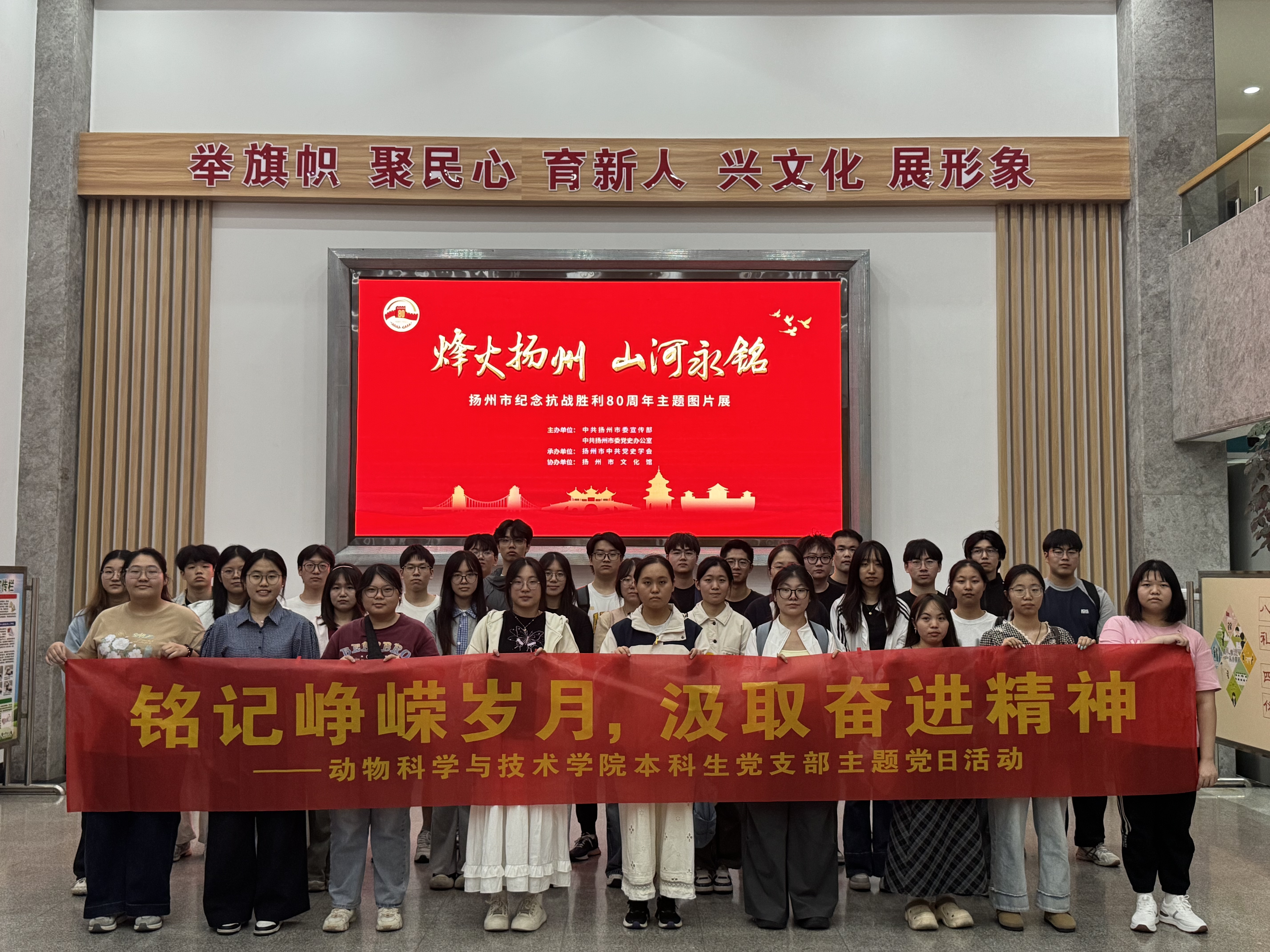 9月29日下午,本科生党支部精心组织全体党员及入党积极分子,前往扬州市文化馆,集中观看“烽火扬州 山河永铭”主题图片展。该展览是扬州市纪念中国人民抗日战争暨世界反法西斯战争胜利80周年的重点活动之一,展厅内一幅幅泛黄的历史影像、一段段翔实的文字记载,清晰还原了扬州军民从沦陷抗争到古城光复的完整抗战历程。