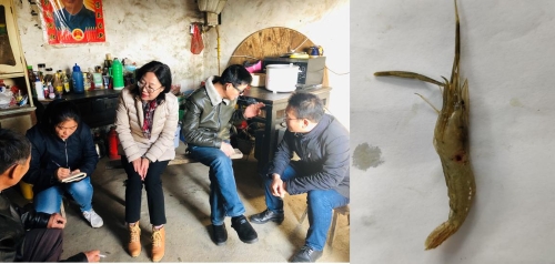 2020年1月3日,江苏现代农业(青虾)产业技术体系病害防控与质量控制创新团家张晓君教授带领团队成员前往兴化市开展青虾病害调研与技术指导,团队成员先后到泰州兴化千垛镇西坝村和海南镇东湖村两个村的多家青虾养殖场开展调研。张晓君教授通过与养殖户的交流,详细了解了该地区青虾的养殖模式、放养密度、喂养情况、水草种植种类以及病害发生情况等。在座谈的过程中了解到,7月份放入的虾苗在10月初开始出现散发性死亡现象,发病青虾鳃部有小红点,部分青虾尾扇发红,通过使用抗菌药物以及消毒剂后,红鳃症状得到缓解,初步怀疑为细菌引起的红鳃病。随后,病害团队成员现场采集发病青虾、水样以及底泥等样品,带回实验室进行后期分析。