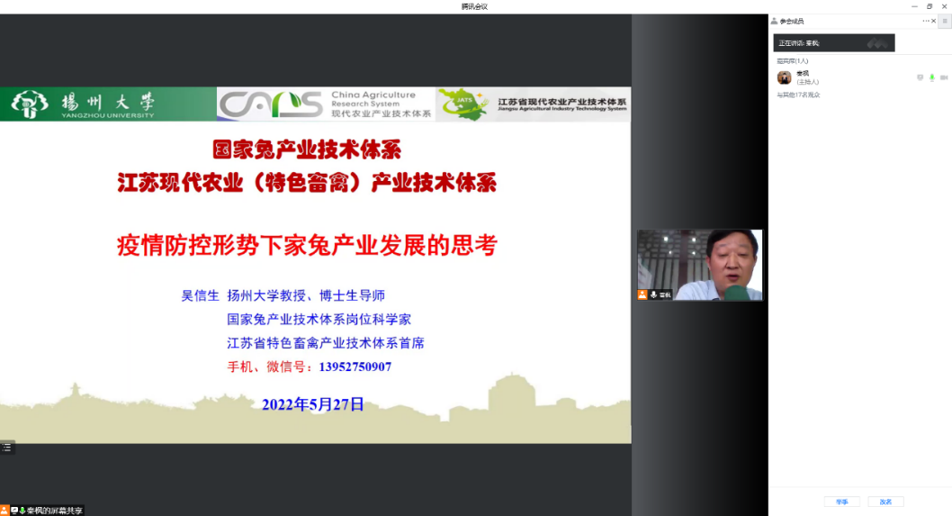 培训班以线下与线上结合的形式进行,参加培训班的有区、乡镇技术人员和养殖场户,共计100余人。吴信生教授围绕疫情防控形式下家兔产业发展的思考,详细讲解了目前疫情防控下家兔产业面临的困难与问题、机遇与挑战,以及当前形式下家兔产业发展的对策。王芳研究员对家兔常发疾病及防控技术措施进行了介绍,重点介绍了兔出血病、家兔消化道病以及家兔疫病防控的具体技术措施。秦枫副研究员对养殖粪污处理及环境控制技术进行了讲解,分享了目前规模兔场粪污处理技术的最新进展,以及环境控制技术的普及应用。培训班上,各位专家与参加人员还就当前遇到的养殖环境环保问题、家兔常见疾病的防治,以及饲料市场波动等问题进行了沟通与讨论。