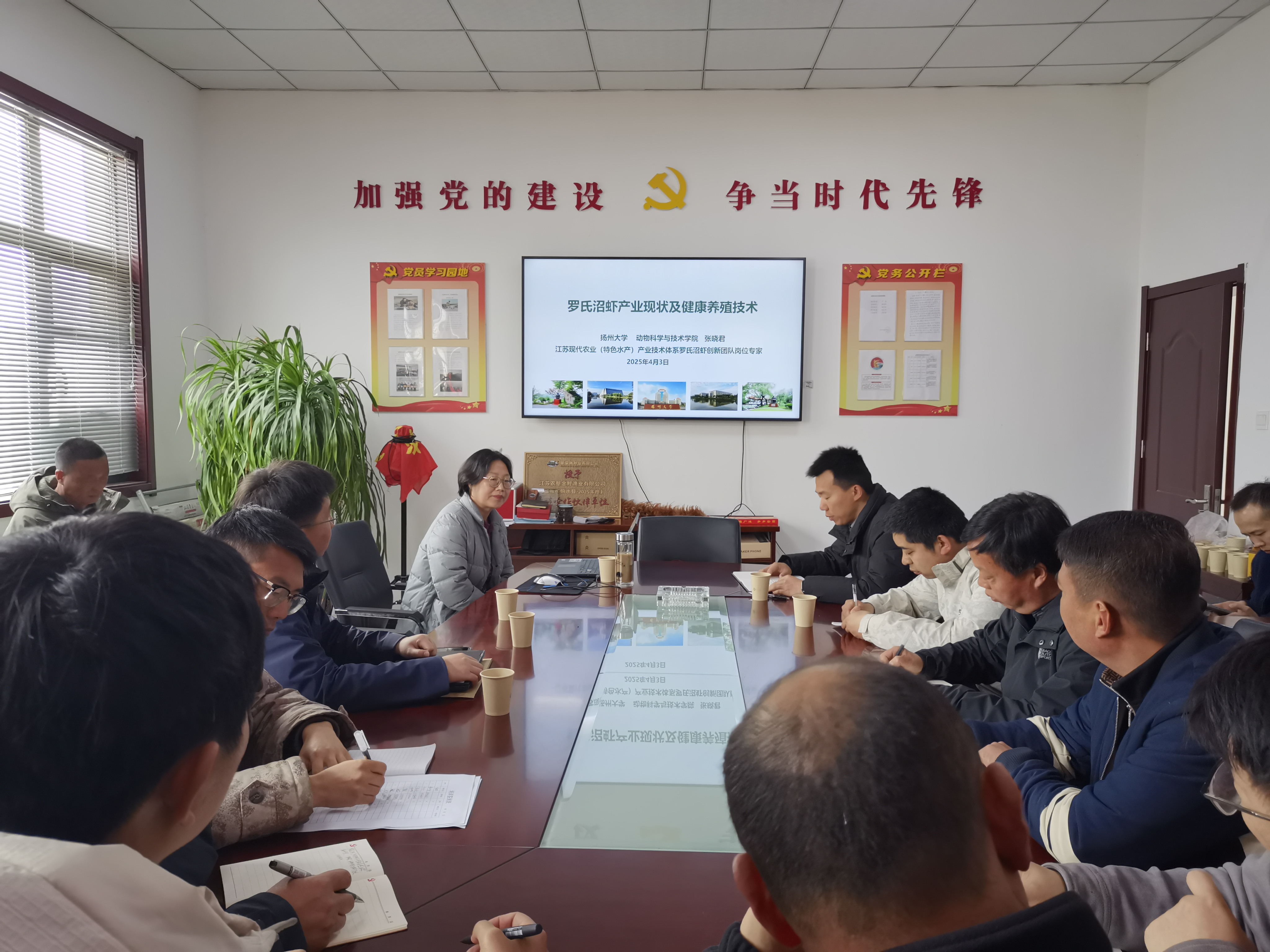 次日,张晓君教授为江苏农垦金鲤渔业有限公司相关技术人员开展了罗氏沼虾健康养殖技术培训,来自公司各部门的技术骨干30余人参与此次培训。张晓君教授结合多年科研与实践经验,深入浅出地从罗氏沼虾产业现状与瓶颈、疾病发生情况、疾病诊断技术、疾病发生的原因及高质量发展对策五个方面进行了系统讲解。培训过程中,张晓君教授还针对技术人员提出的实际问题给予了专业解答,并就今后的养殖管理提出了科学、可行的指导意见。