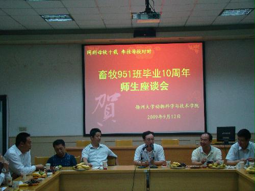 9月12日下午,畜牧951班毕业10周年返校师生座谈会在院多功能厅举行,刘金存、陈国宏、王志跃、杨章平等院领导以及该班班主任、部分任课教师出席座谈会。