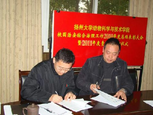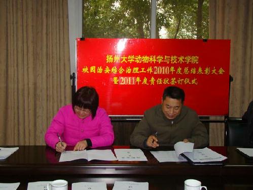 2011年1月14日下午,学院综合治理领导小组召开会议,会议由杨章平副院长主持,首先杨院长对学院2010年综合治理工作进行总结,并对2011年的综治工作进行了部署;其次举行2011年综合治理责任状和消防责任状签字仪式,由院领导与系主任们签订责任状;再次由保卫处丁旭副处长对学院综治工作作指导;最后由王志跃常务副书记作总结讲话。