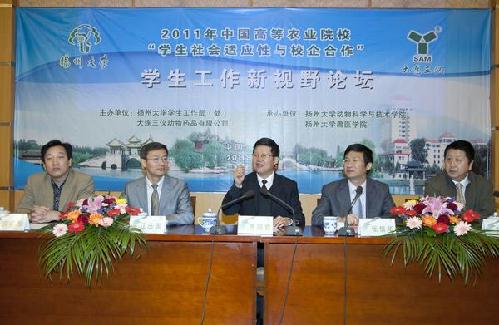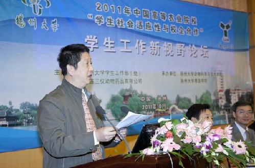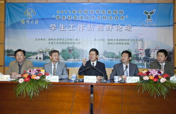 10月27日,由大连三仪动物药品有限公司倡议,并由我校学生工作处和大连三仪公司主办,我院和兽医学院共同承办的“2011中国高等农业院校‘学生社会适应性与校企合作’学生工作新视野论坛”在校多功能厅举行。副书记、副校长芮鸿岩出席论坛开幕式。来自全国20余所农业院校和20多家重点农牧企业的80余名代表参加论坛。