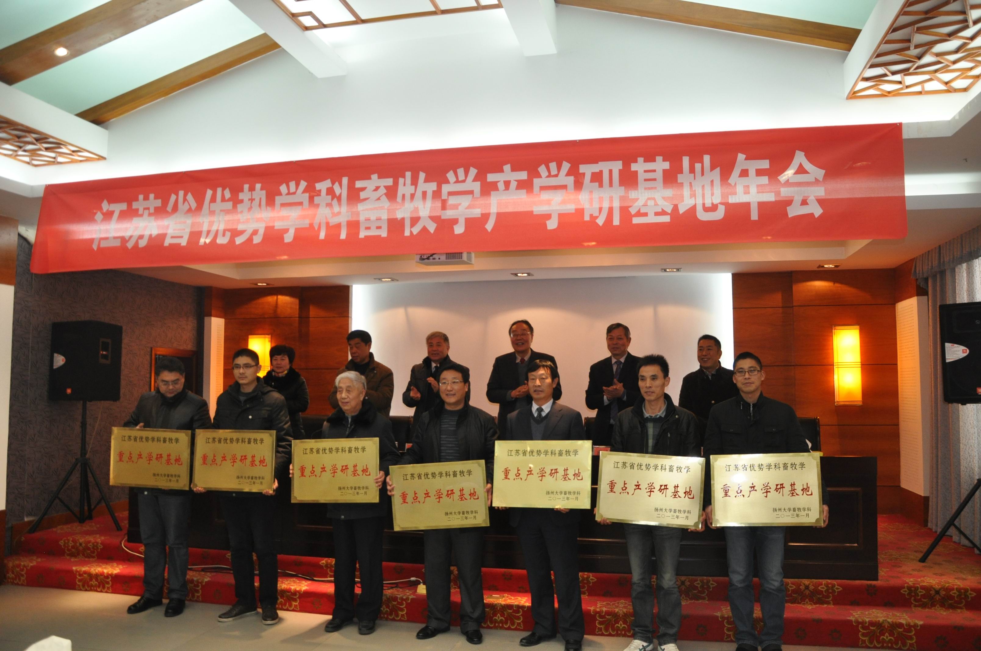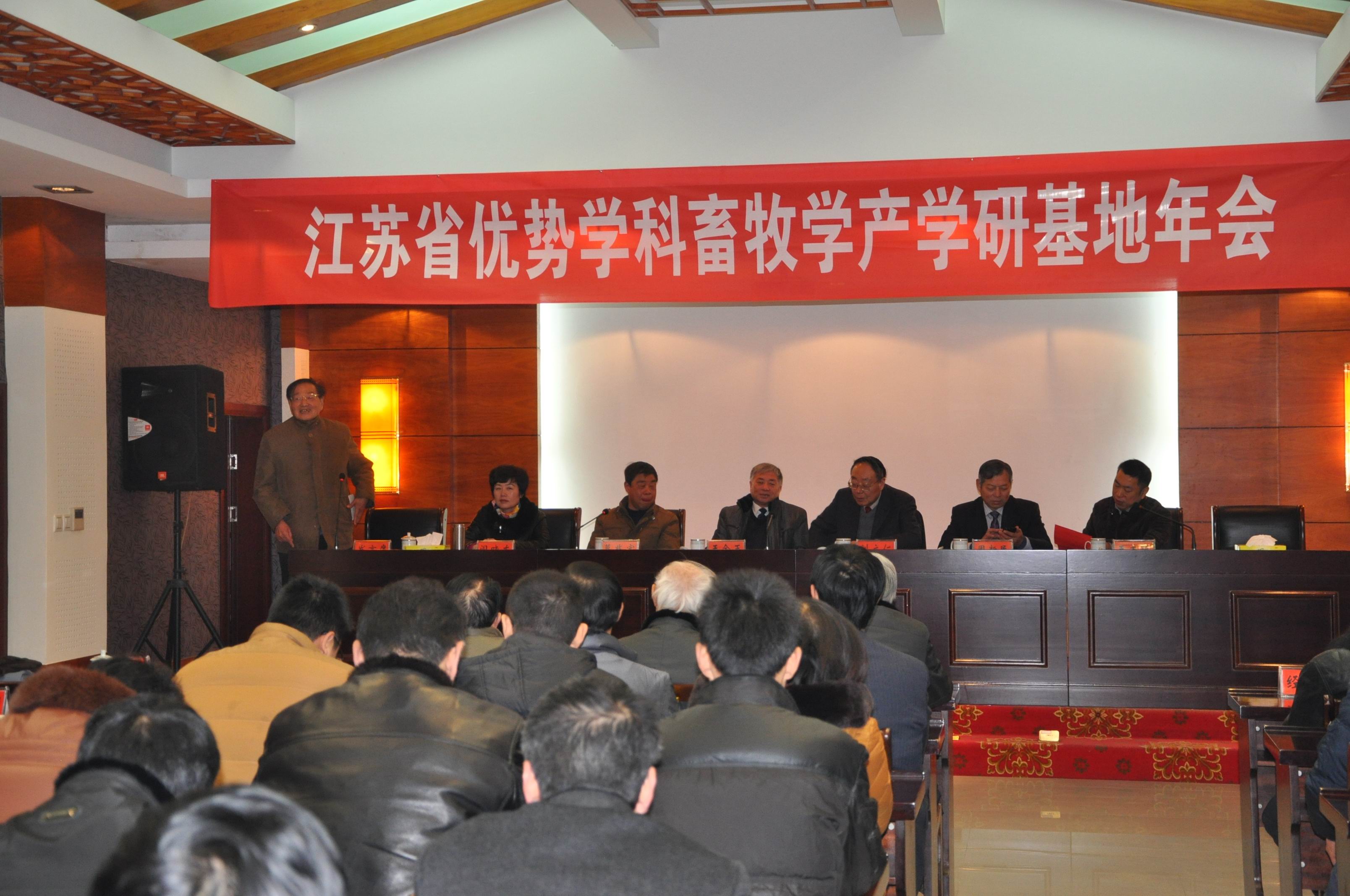 会议由王志跃院长主持,省优势学科畜牧学学科带头人王金玉教授作了“江苏省优势学科畜牧学建设总体进展及产学研基地合作情况”的报告,王金玉教授从优质资源建设、创新团队建设、人才培养、科研创新及产学研基地合作等五个方面,总结了2012年学科相关工作。江苏京海禽业集团有限公司副总经理顾玉萍、扬州天歌鹅业发展有限公司顾问赵万里教授、江苏现代畜牧科技园代表——江苏畜牧兽医职业技术学院学院副院长葛兆宏等重点合作单位代表,分别介绍了多年来与我院畜牧学学科的合作情况及取得的主要成绩。会上,学科还授予有关基地“江苏省优势学科畜牧学重点产学研基地”铜牌。