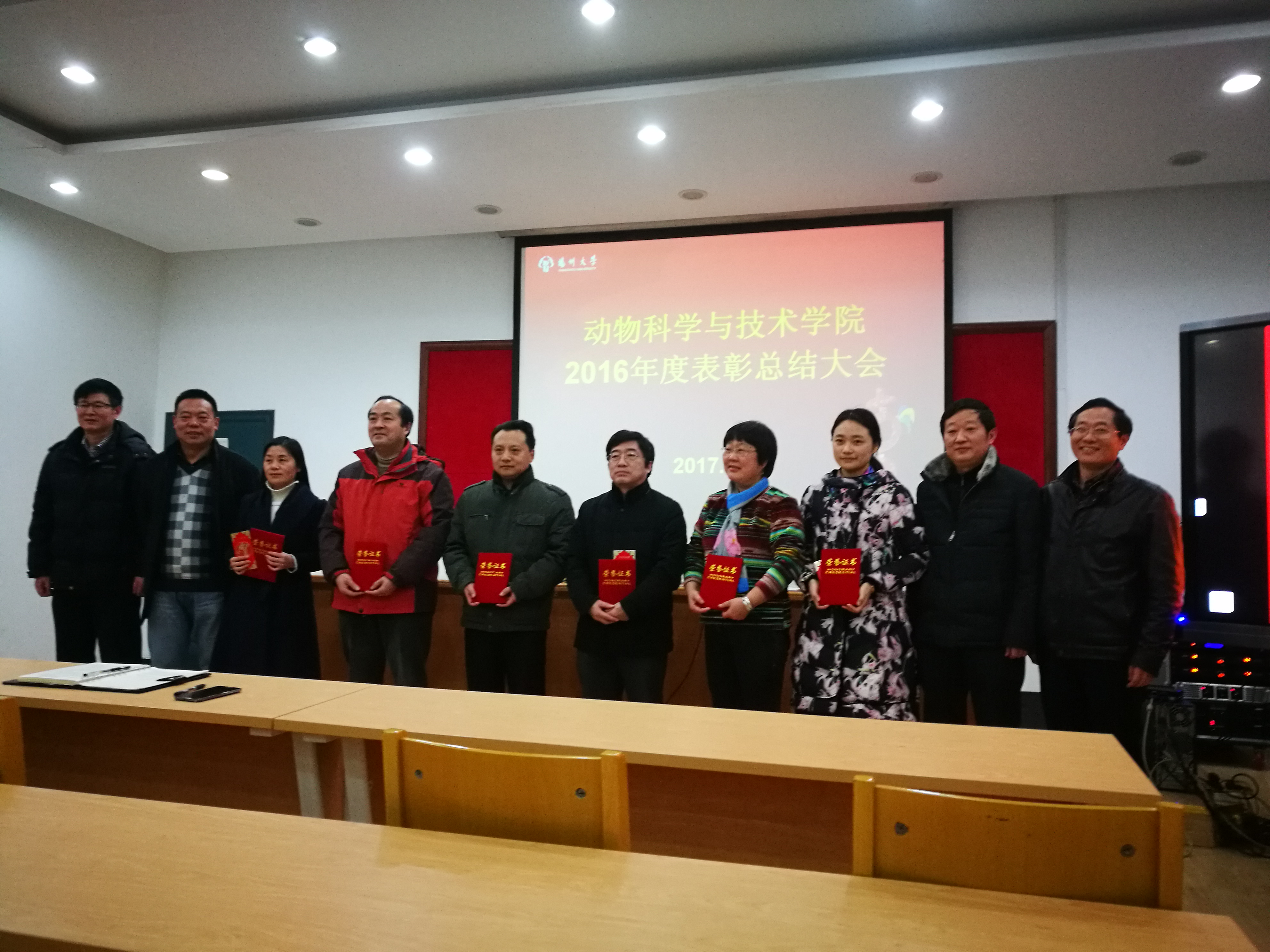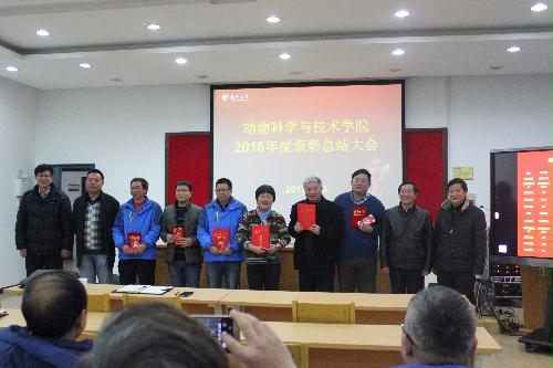 总结大会重点表彰了2016年江苏省教学名师李碧春教授,2016年校金讲台奖获得者刘大林教授,2016年江苏省科技进步一等奖获得者王金玉教授,2016年教育部自然科学优秀成果一等奖获得者李碧春教授以及为学院创收工作作出重要贡献的吉挺教授、喻礼怀副教授和孙寿永老师。全体院领导为2016年学院考核优秀的部门:动物遗传育种系、动物营养与饲料科学系、动物繁殖与生产系、水产科学系、动物营养与饲料科学党支部、综合办公室颁发荣誉证书和奖励。
