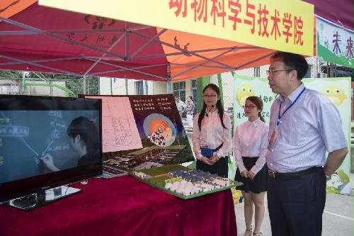 我院此次迎新分为文汇路校区和淮海路校区两个迎新分场。在淮海路校区,本科生自制“未来农场”沙盘,由金晶、张文慧等研究生向围观的学生家长,详细地说明讲解农场设计理念及模型每个结构的功能与创意,同时让新生与家长对专业有更进一步了解。并设立卡通鸡图案为拍照点,记录新生家长与孩子在扬大留下第一张合影。现场还利用多媒体循环播放学院宣传片,氛围热烈,得到新生与家长的围观与关注。