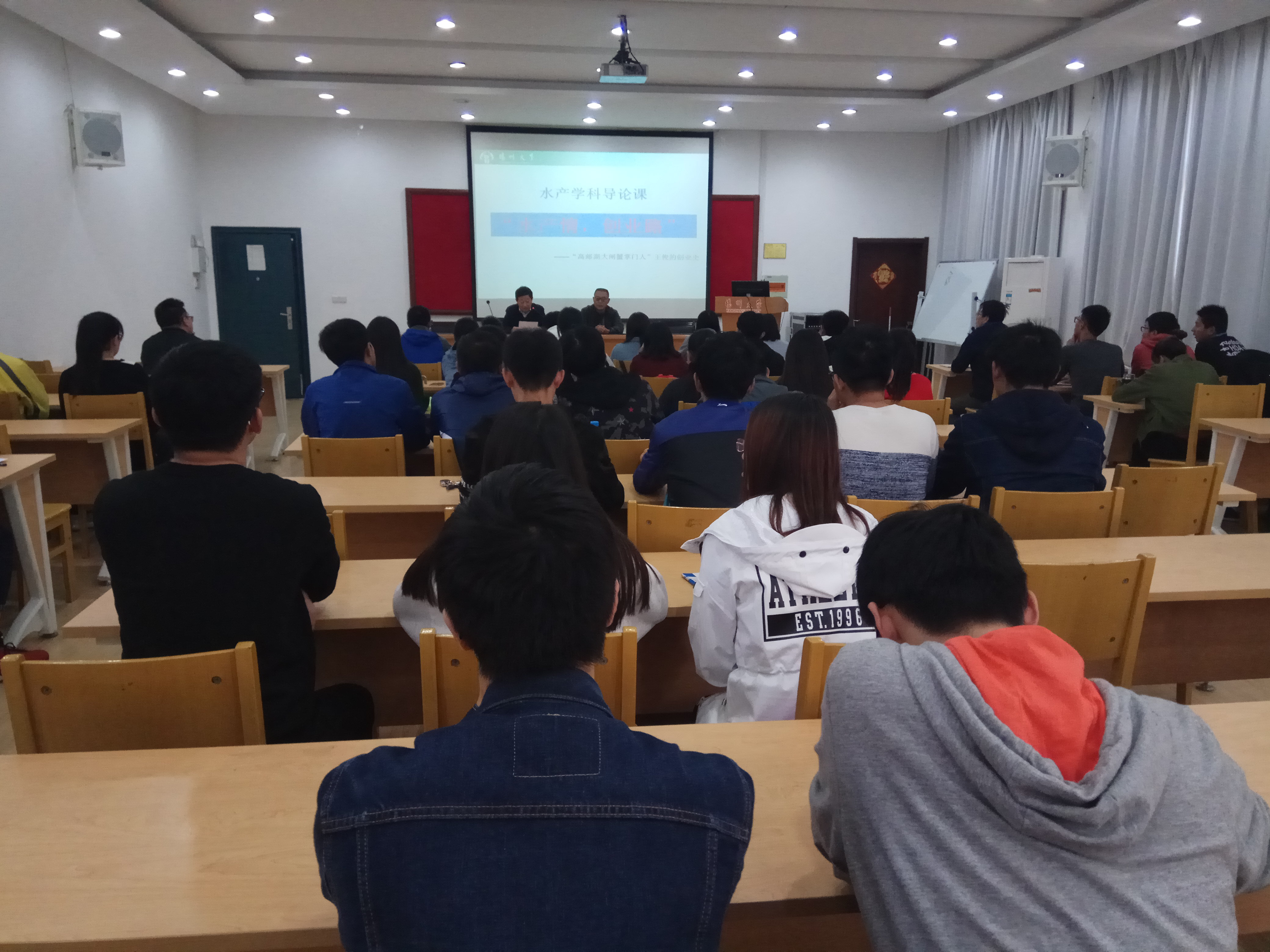 11月1日下午,高邮市湖畔水产专业合作社董事长王俊应我院邀请,为我院水产17级学生作了题为“水产情、创业路”的精彩讲座。讲座由副院长吴信生主持。