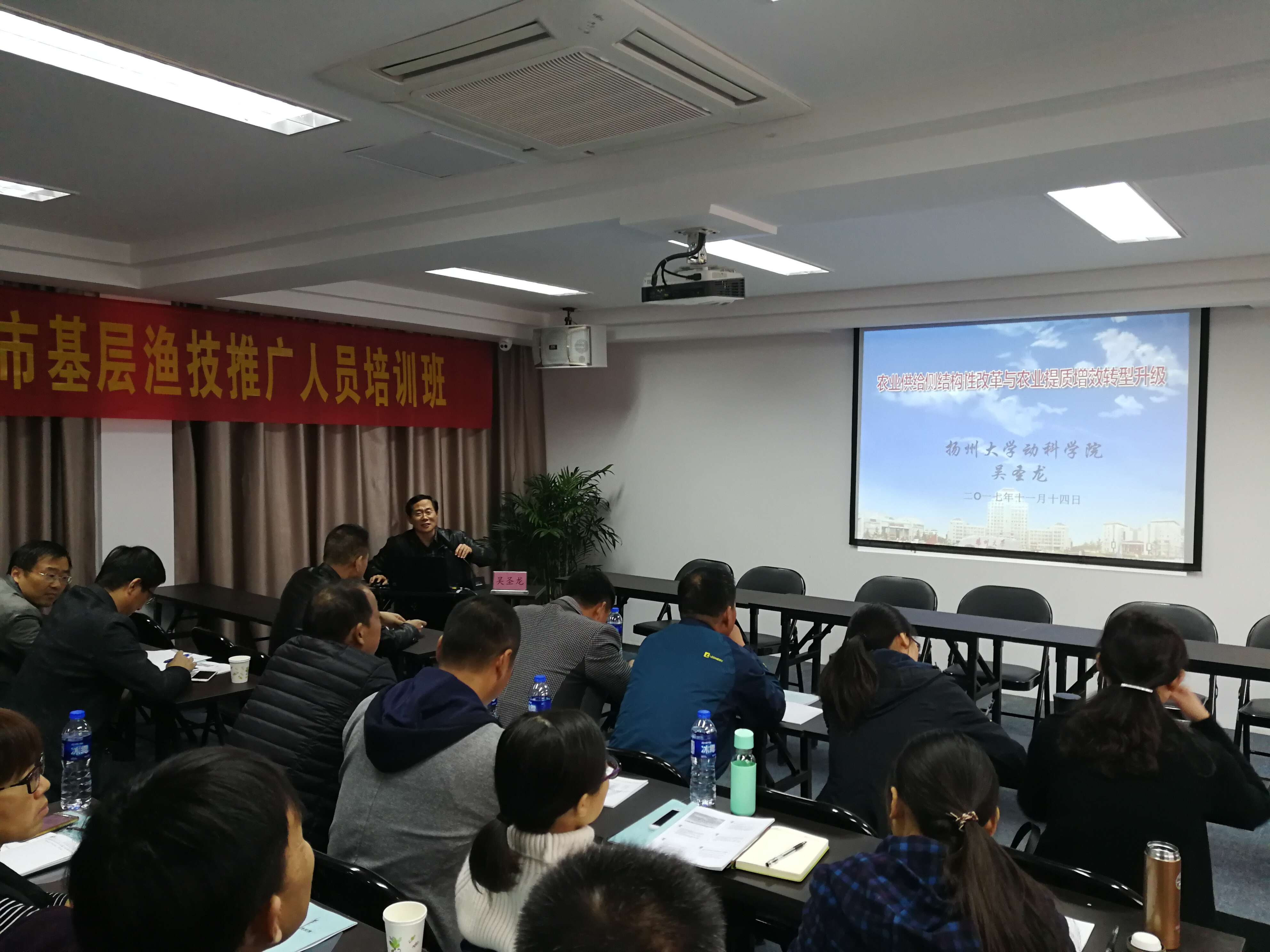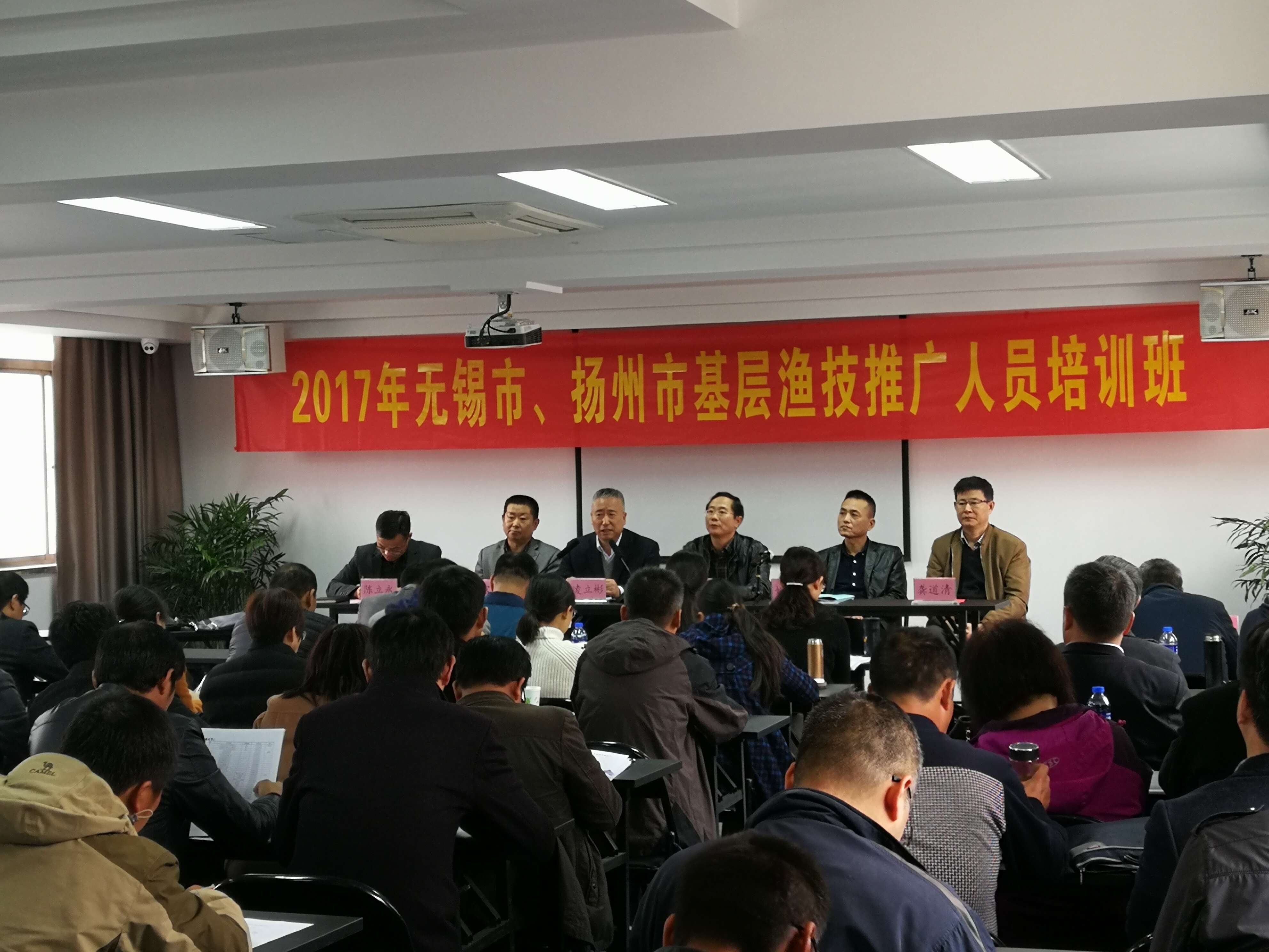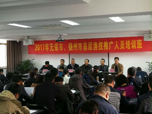 11月14日-11月17日,由江苏省海洋渔业局主办的2017年无锡市、扬州市基层渔技推广人员培训班在我院农业部“牧、草、渔”新型农民培训中心成功举行。我院党委书记吴圣龙,副院长龚道清,江苏省海洋与渔业局科教处处长凌立彬,无锡市农委科教处处长姚富春、扬州市农业委员会副主任苏家富等相关部门专家领导出席了此次开班仪式。开班仪式由院党委副书记陈立永主持。来自无锡市、扬州市基层渔业技术骨干125人参加了本次培训,培训为期4天,合计课程7次,基地参观考察交流1次。