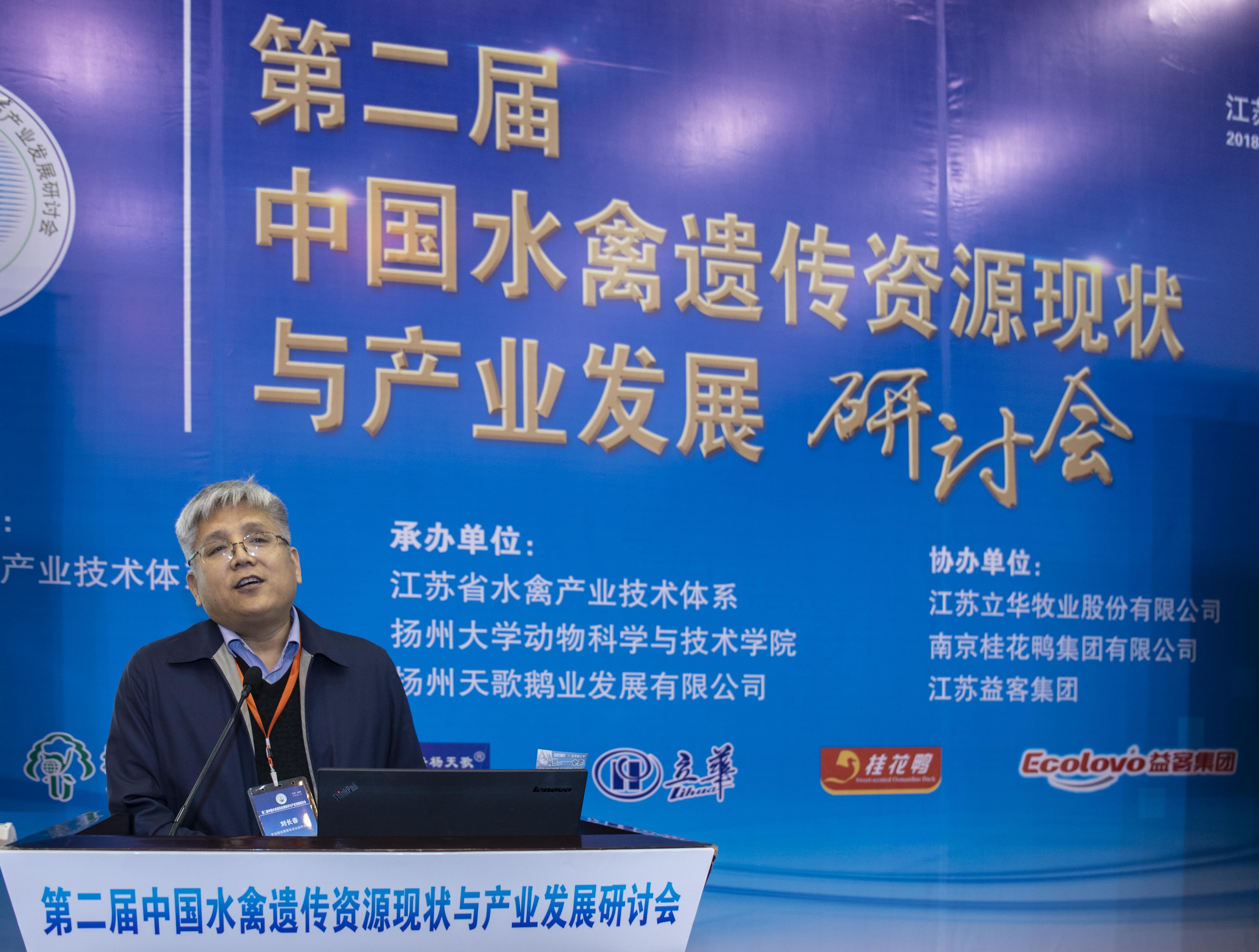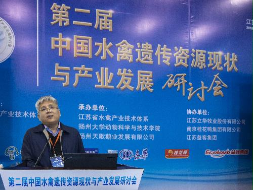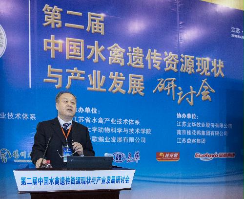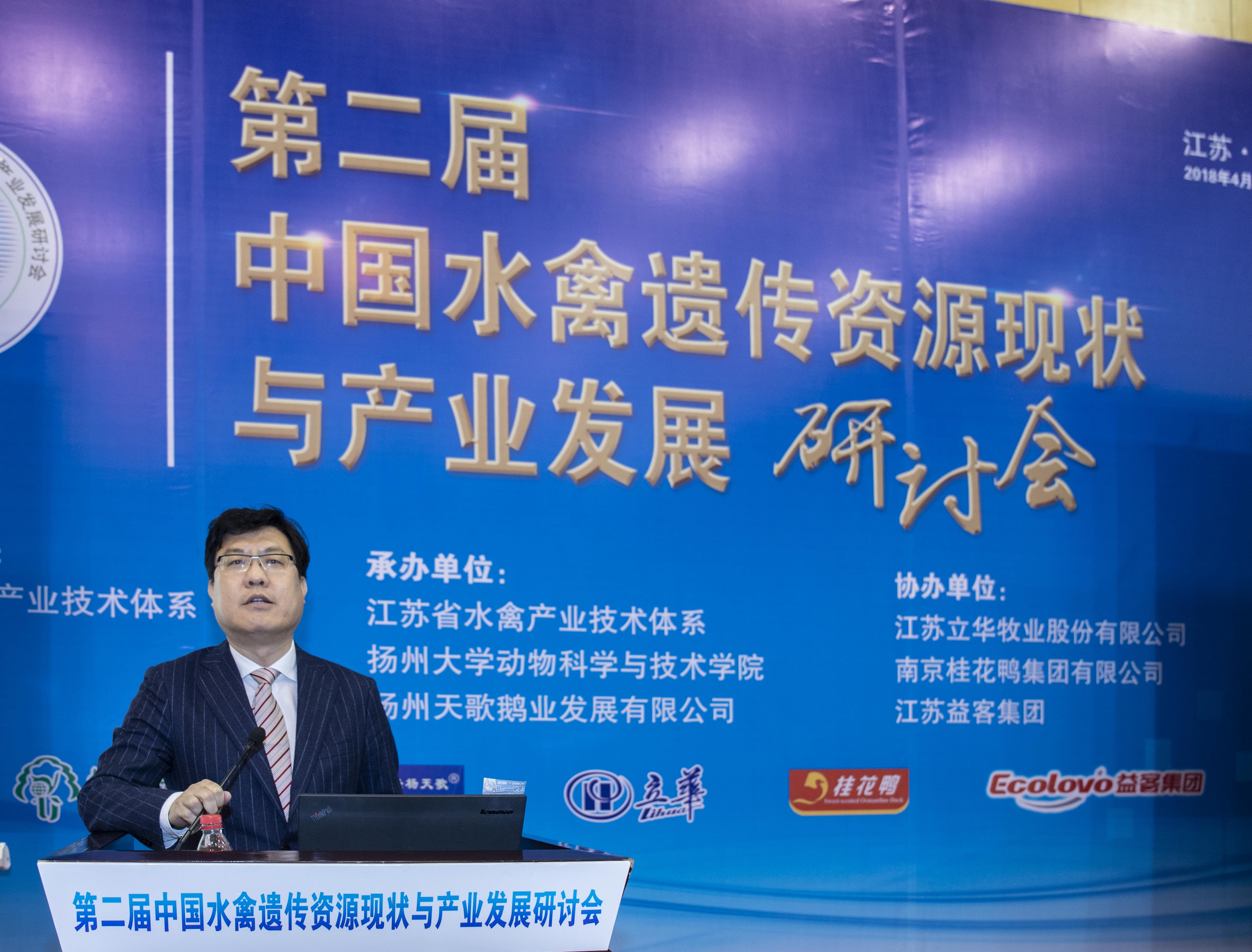 2018年4月14-15日,由国家水禽产业技术体系主办,江苏省水禽产业技术体系、扬州大学动物科学与技术学院、扬州天歌鹅业发展有限公司承办,江苏立华牧业股份有限公司、南京桂花鸭集团、江苏益客集团协办的“第二届中国水禽遗传资源现状与产业发展研讨会”在江苏扬州召开,中国畜牧兽医学会副理事长乔玉锋、江苏省农业委员会副主任蔡恒、全国畜牧总站品种资源处处长刘长春、全国畜牧总站牧业发展处处长杨红杰、国家水禽产业技术体系首席科学家侯水生研究员、扬州大学副校长陈国宏教授、江苏省家禽科学研究所所长邹剑敏研究员、江苏农牧职业技术学院党委书记吉文林研究员等行业领导和专家莅临大会开幕式,来自国家水禽产业技术体系、国内大专院校和企业的水禽行业精英共计100余人参加了本次大会。