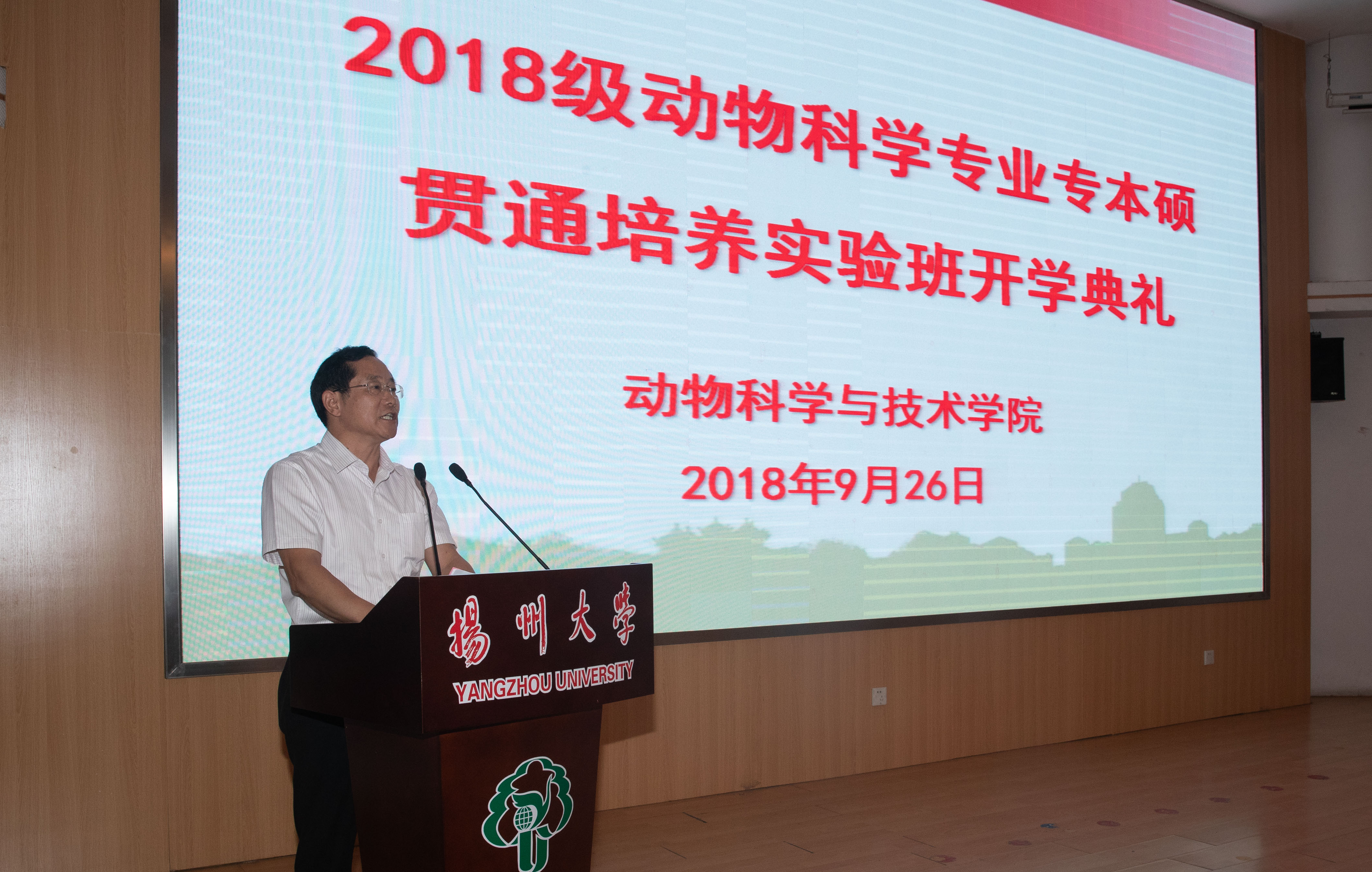 9月26日,学院在荷花池校区逸夫报告厅举办2018级动物科学专业专本硕贯通培养实验班开学典礼。校党委常委、副校长陈国宏,山东畜牧兽医职业学院党委书记郑立森、副院长王金诺,江苏农牧科技职业学院副院长蒋春茂,校继续教育处处长贡福海,院长杨章平出席了本次会议。院党委书记吴圣龙主持开学典礼。