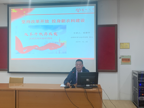 杨章平以“坚持改革开放,投身新农科建设”为题,阐述了改革开放40年的发展历程、理论价值和实践意义。同时结合新农科建设,要求全院党员学深悟透总书记的回信精神,紧紧围绕新型人才培养、专业优化攻坚、课程改革创新、实践基地建设、优质师资培育、强化协同育人、提升质量标准、深化开放合作八个方面,坚持立德树人,明确新农科建设的目标,理清新农科建设的思路,找准新农科建设的路径,交出一份让师生满意的新农科建设动科答卷。