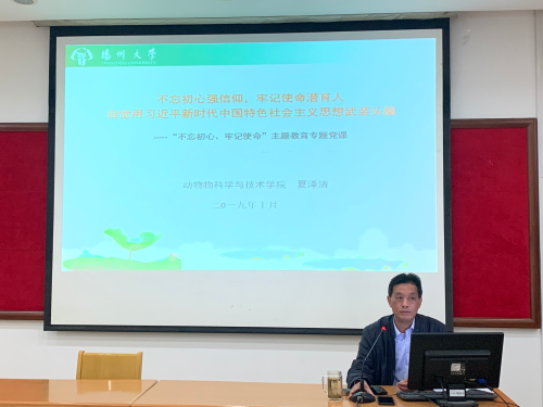 夏泽清作了题为“不忘初心强信仰,牢记使命潜育人,自觉用习近平新时代中国特色社会主义思想武装头脑”的专题党课,要求全院党员加强理论武装、提高政治素养,认真学习贯彻习近平新时代中国特色社会主义思想;守初心、担使命,全面领会习近平新时代中国特色社会主义思想核心内容;提升师德修养、提高师德水平,努力争做“四有”好老师。不断增强建设高水平研究型学院的自信,着力培养创新型、复合型、应用型知农爱农新型人才。