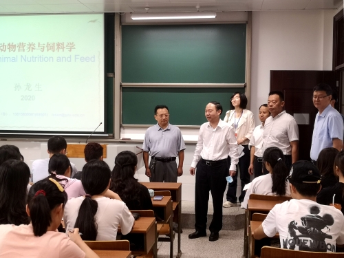 在23号楼207教室,孙龙生正在和学生交流新学期《水产动物营养与饲料学》的学习要求。焦新安校长走到他们中间,同学们报以热烈掌声。焦新安校长首先对各位同学经历这次疫情大考再次回到久违又熟悉的母校校园表示热烈地欢迎和祝贺,并与师生交流了当前新形势所带来的新变局和新挑战。