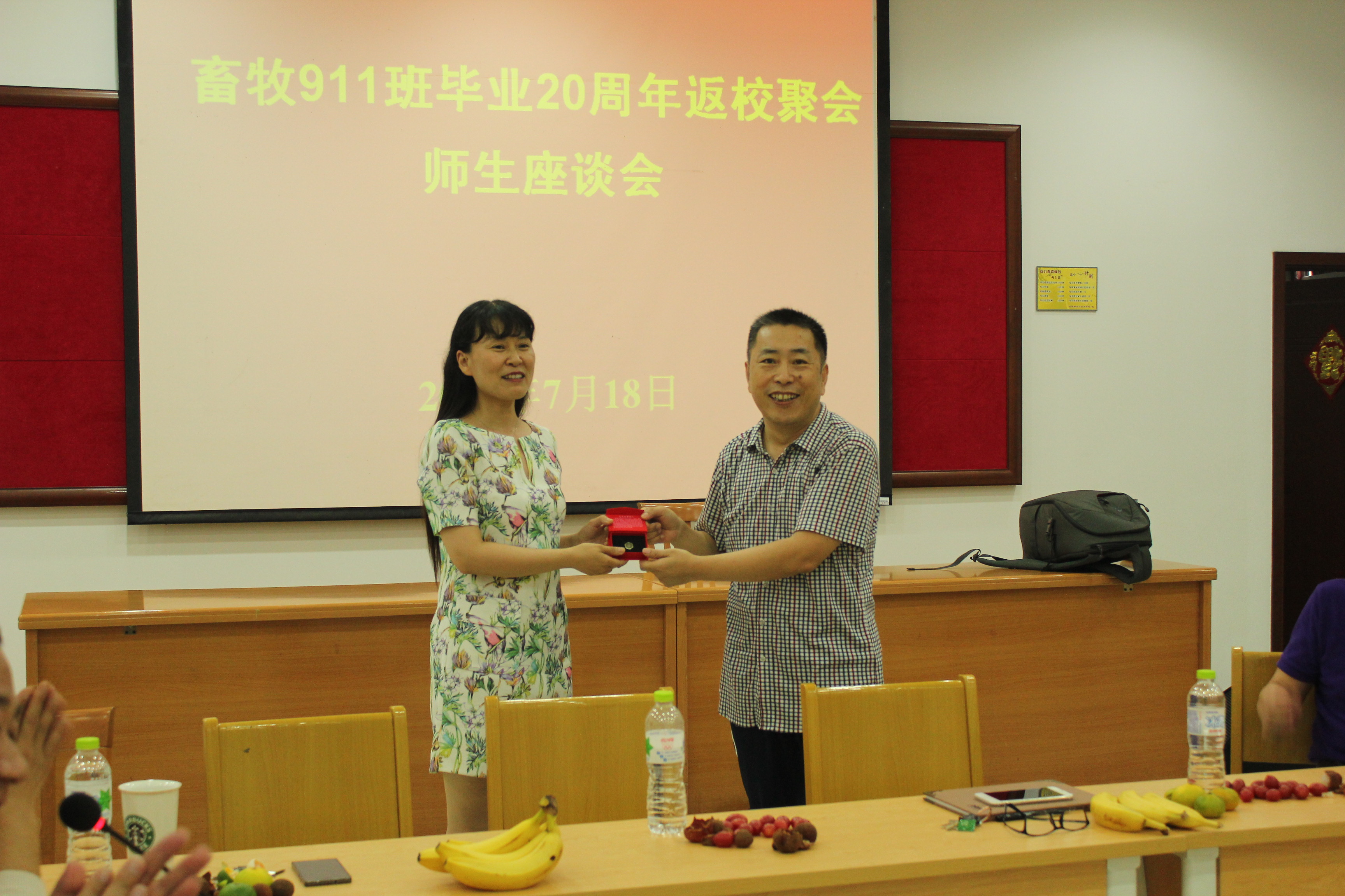 7月18日,我院职教921、畜牧911、畜牧0101三个班近100名校友分别返校举行毕业20周年、10周年秩年聚会。院党委书记赵文明到场致欢迎辞,王志跃院长为校友代表佩戴校友徽章并介绍了学院近期的发展情况,感谢校友们对学院的支持和帮助。校友们纷纷发言,汇报毕业后的工作、生活情况,回顾大学四年的美好往事,历述母校老师的言传身教,感谢母校的培养,期盼母校母院事业辉煌。