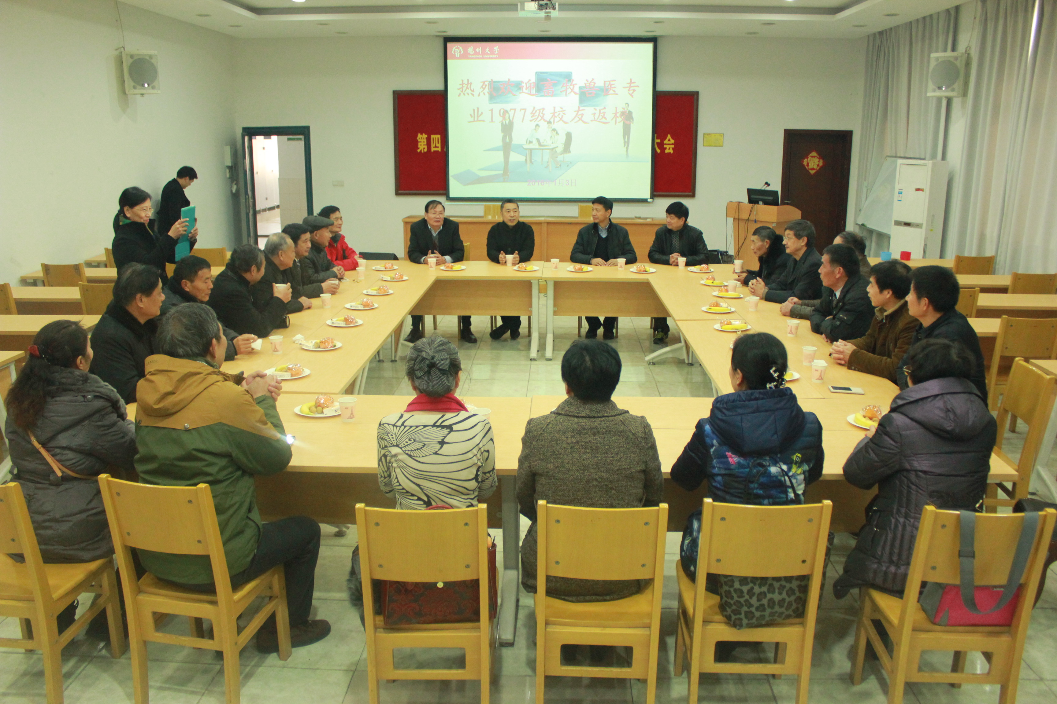 在2016年新年到来之际,1月3日,畜牧兽医专业1977级30多位校友返校聚会。座谈会上,王志跃院长介绍了学院建设发展情况,感谢校友们对母校、母院的关心和支持,真诚欢迎校友们返回母校走走、看看;校友们各自介绍了自己学习、工作、生活和家庭情况,回忆在母校求学的青春岁月,感谢母校老师们的辛勤培养,场面热烈而温馨。