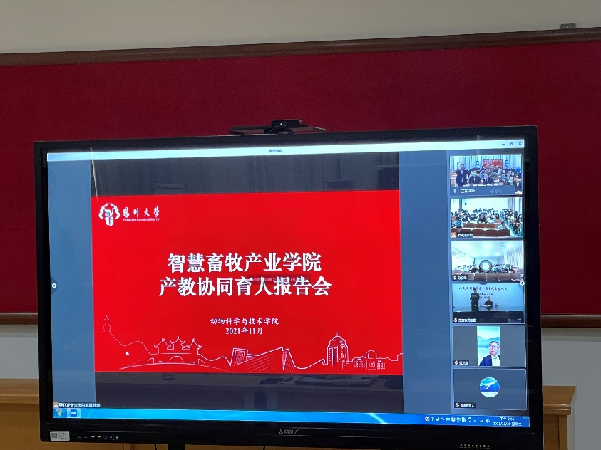 为更好地发挥智慧畜牧产业学院作用,积极推进专业与企业特色资源之间的有效整合,共同拓展专业人才培养空间,构建新型专业建设和人才培养模式,打造专业特色,近日,学院特邀优秀企业家——江苏京海禽业集团顾云飞董事长、大连三仪集团江庆国副董事长和南京卫岗乳业有限公司牧业公司田雨总经理等,采用线上和线下相结合方式,就“探索校企联合人才培养新模式和产教协同育人新机制”与师生进行了探讨交流。
