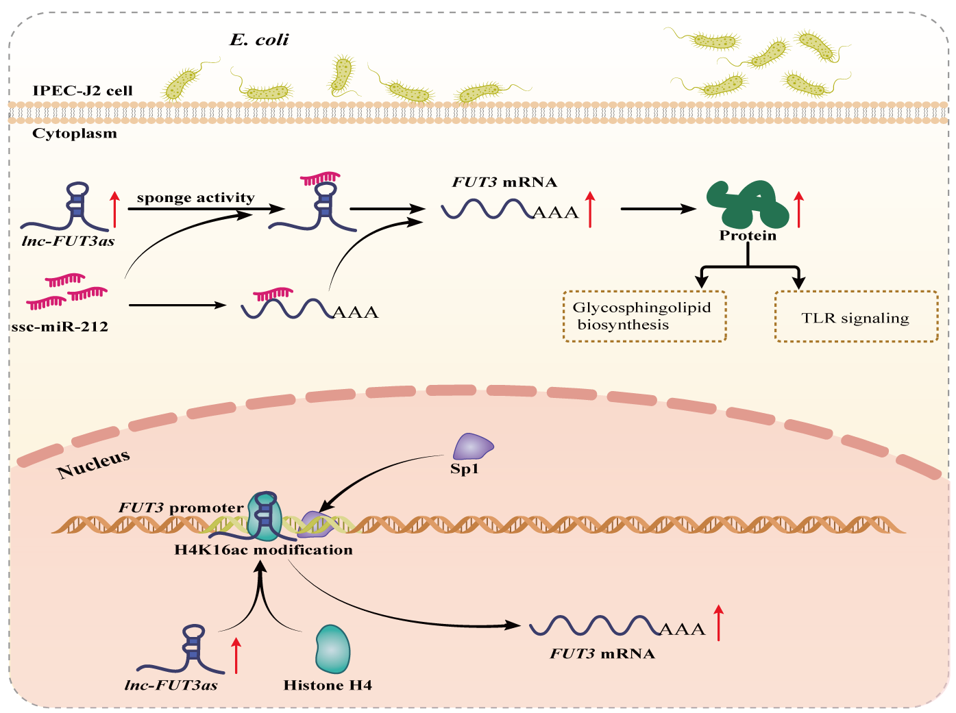 LncRNA-FUT3as调控F18大肠杆菌易感性的分子机制示意图