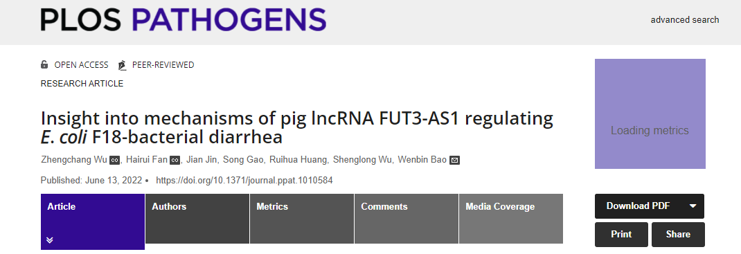 2022年6月13日,我院江苏省现代农业(生猪)技术体系良种繁育创新团队在国际病原学权威期刊《PLoS Pathogens》在线发表了题为“Insight into mechanisms of pig lncRNA FUT3-AS1 regulating E. coli F18-bacterial diarrhea”的研究论文,该论文首次系统解析了仔猪细菌性腹泻抗性的遗传基础和调控机制,确定了仔猪腹泻抗性相关功能分子标记物及靶标基因。