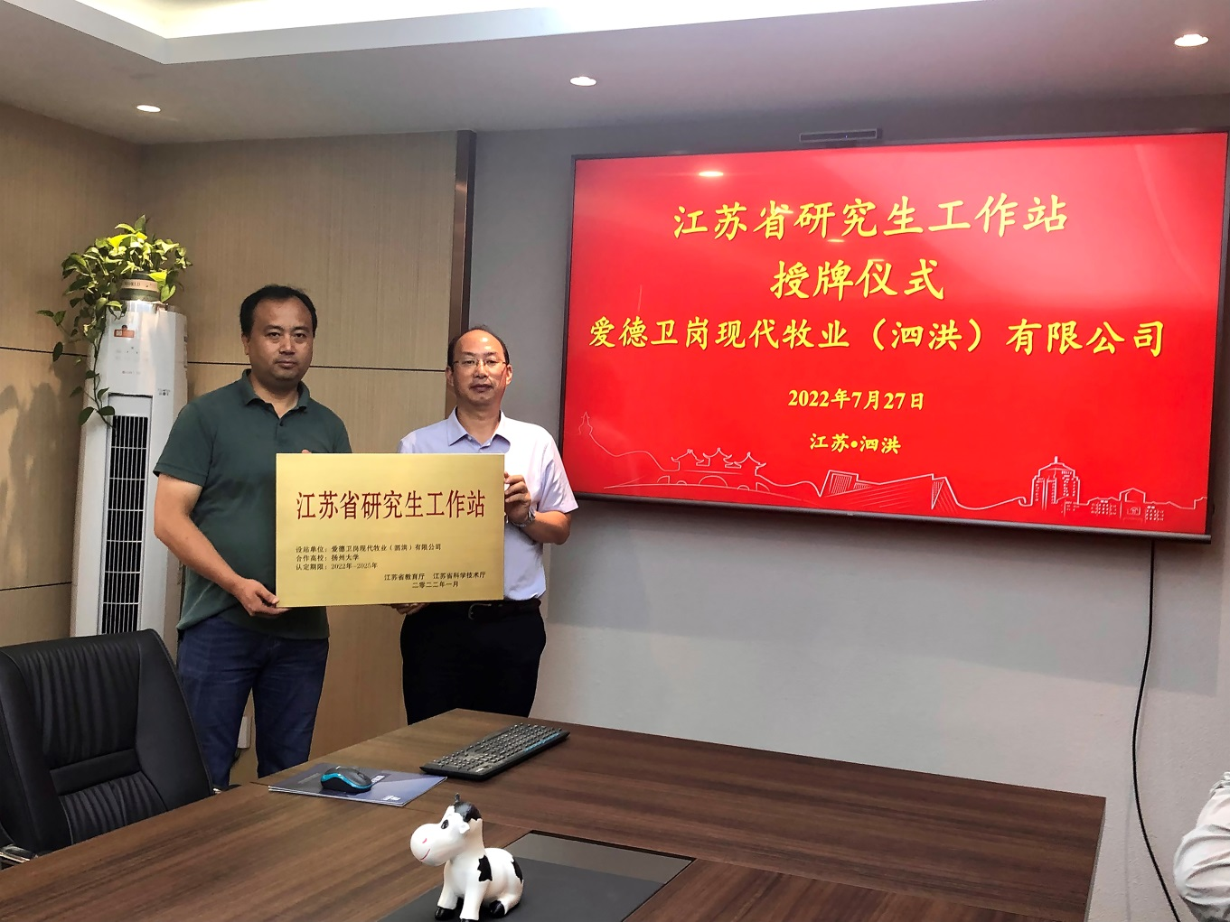 爱德卫岗现代牧业(泗洪)有限公司此前与扬州大学共同承担了江苏省农业科技自主创新重大项目、江苏现代农业(奶牛)产业技术体系等项目,获江苏省农业技术推广奖一项。公司将以此次江苏省研究生工作站授牌为契机,进一步加强工作站内涵建设,提高奶牛健康养殖技术和科学研究及人才培养质量,尽早实现建设成为江苏省优秀研究生工作站。
