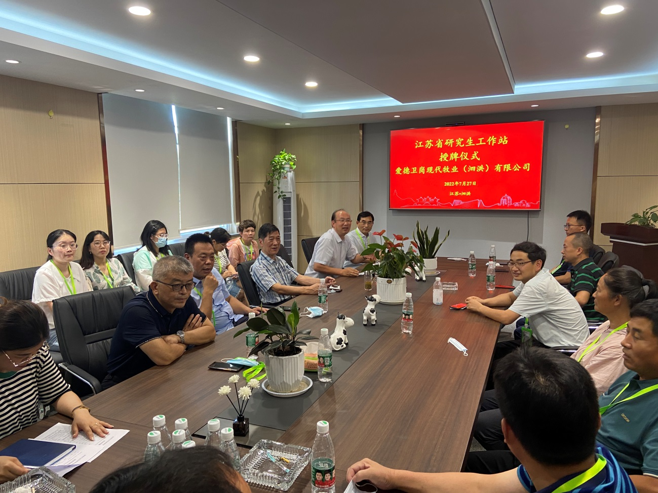 2022年7月27日,江苏省研究生工作站授牌仪式在爱德卫岗现代牧业(泗洪)有限公司举行。江苏省畜牧总站贡玉清副站长、江苏现代农业(奶牛)产业技术体系首席专家、扬州大学动物科学与技术学院杨章平院长、江苏现代农业(奶牛)产业技术体系各推广示范基地主任、南京卫岗乳业有限公司副总裁田雨高级畜牧师、泗洪县科技局相关科室负责人、爱德卫岗现代牧业(泗洪)有限公司负责人陶招红及校内负责人毛永江教授及在站研究生等30余人出席授牌仪式。