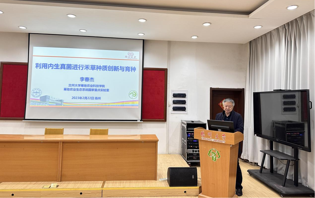 2月22日上午,兰州大学草地农业科技学院院长、草地农业教育部工程研究中心主任、国家林草局草业研究中心主任、甘肃省西部草业技术创新中心主任李春杰教授和柴琦教授受邀到访扬州大学动科院。李春杰教授以“利用内生真菌进行禾草种质创新与育种”为主题作学术报告。草业科学系全体师生参加报告会,副院长严学兵主持活动。