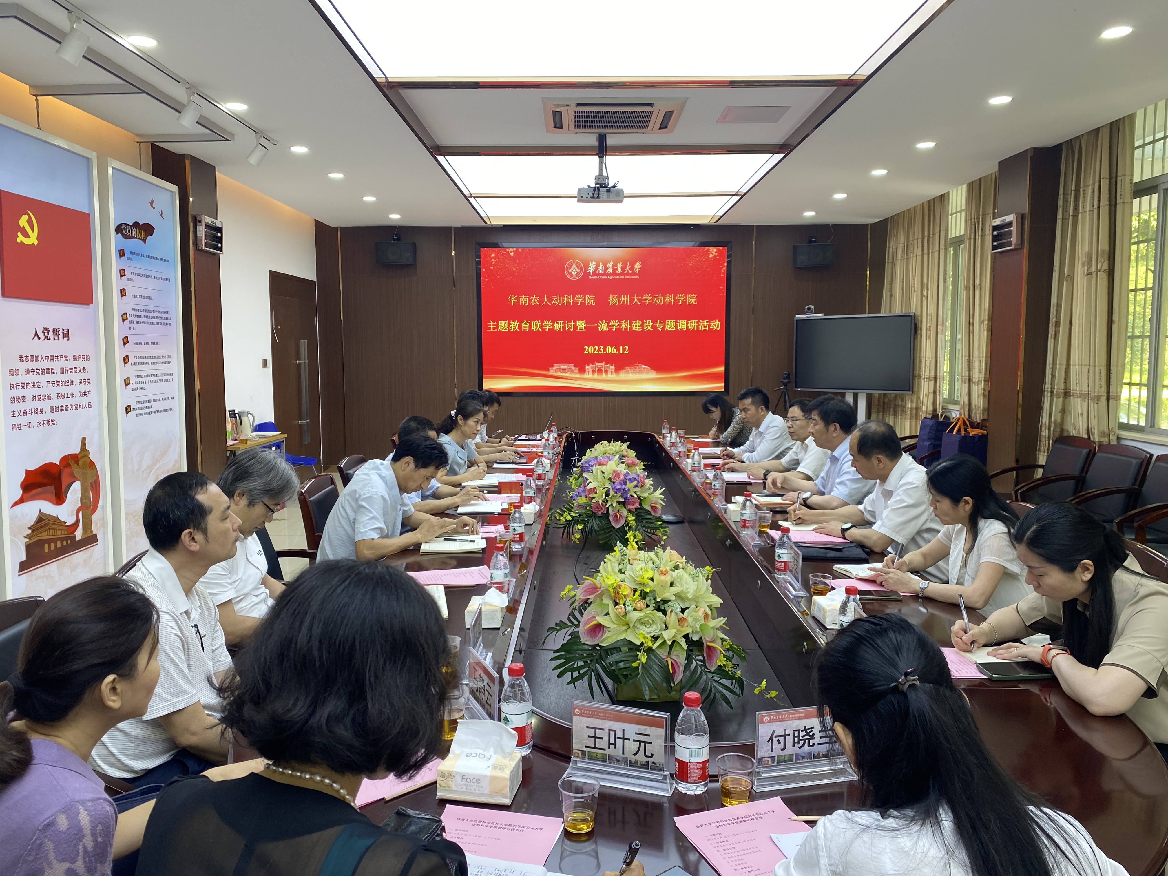 为进一步落实主题教育部署要求,以调查研究促进学院高质量发展,提高学院学科竞争力、人才培养质量、科研水平,吸收和借鉴兄弟院校的先进经验。6月12日,学院党委书记刘春秋、院长常国斌一行八人前往华南农业大学动物科学学院开展主题教育联学研讨暨一流学科建设专题调研活动。