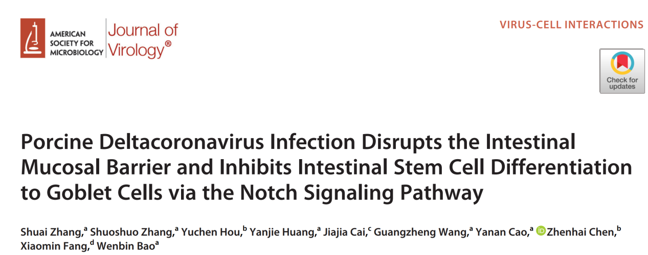 近日,我院江苏现代农业(生猪)产业技术体系良种繁育创新团队在国际病毒学权威期刊《Journal of Virology》在线发表了题为“PDCoV infection disrupts the intestinal mucosal barrier and inhibits intestinal stem cell differentiation to goblet cells via Notch signaling pathway”的研究论文。该研究发现猪德尔塔冠状病毒(Porcine deltacoronavirus, PDCoV)通过激活Notch信号通路抑制肠道干细胞向杯状细胞的分化并抑制黏蛋白分泌,进而破坏新生仔猪的肠道黏膜屏障,这项研究为冠状病毒感染引起猪肠道黏膜屏障功能障碍的机制提供了一个新的见解。