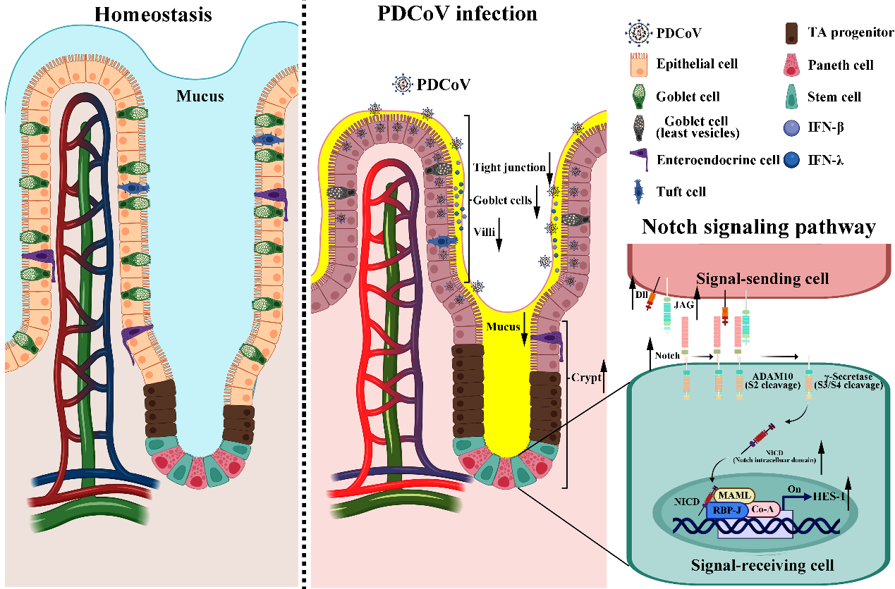 PDCoV是一种新发的猪肠道冠状病毒,感染引起猪的严重呕吐、水样腹泻和脱水等临床症状,甚至致死率高达30%~80%,给养猪业造成巨大的经济损失。肠道黏膜屏障能够抵御肠道病原体入侵宿主细胞,其中杯状细胞及其分泌的黏蛋白是肠道黏膜屏障的重要组成部分。该研究发现新生仔猪感染PDCoV后的肠道屏障受到严重破坏,特别是肠绒毛萎缩,隐窝深度增加,紧密连接破坏;PDCoV感染可调节肠道杯状细胞的功能和分化,从而破坏新生仔猪的肠道黏膜屏障,其中杯状细胞的数量及其分泌的黏蛋白MUC2水平显著降低;通过肠道类器官模型进一步研究发现, PDCoV感染激活Notch信号通路,导致HES-1的表达上调和ATOH-1的表达下调,从而抑制了肠道干细胞向杯状细胞的分化及其黏蛋白的分泌,最终导致肠道黏膜屏障的破坏。