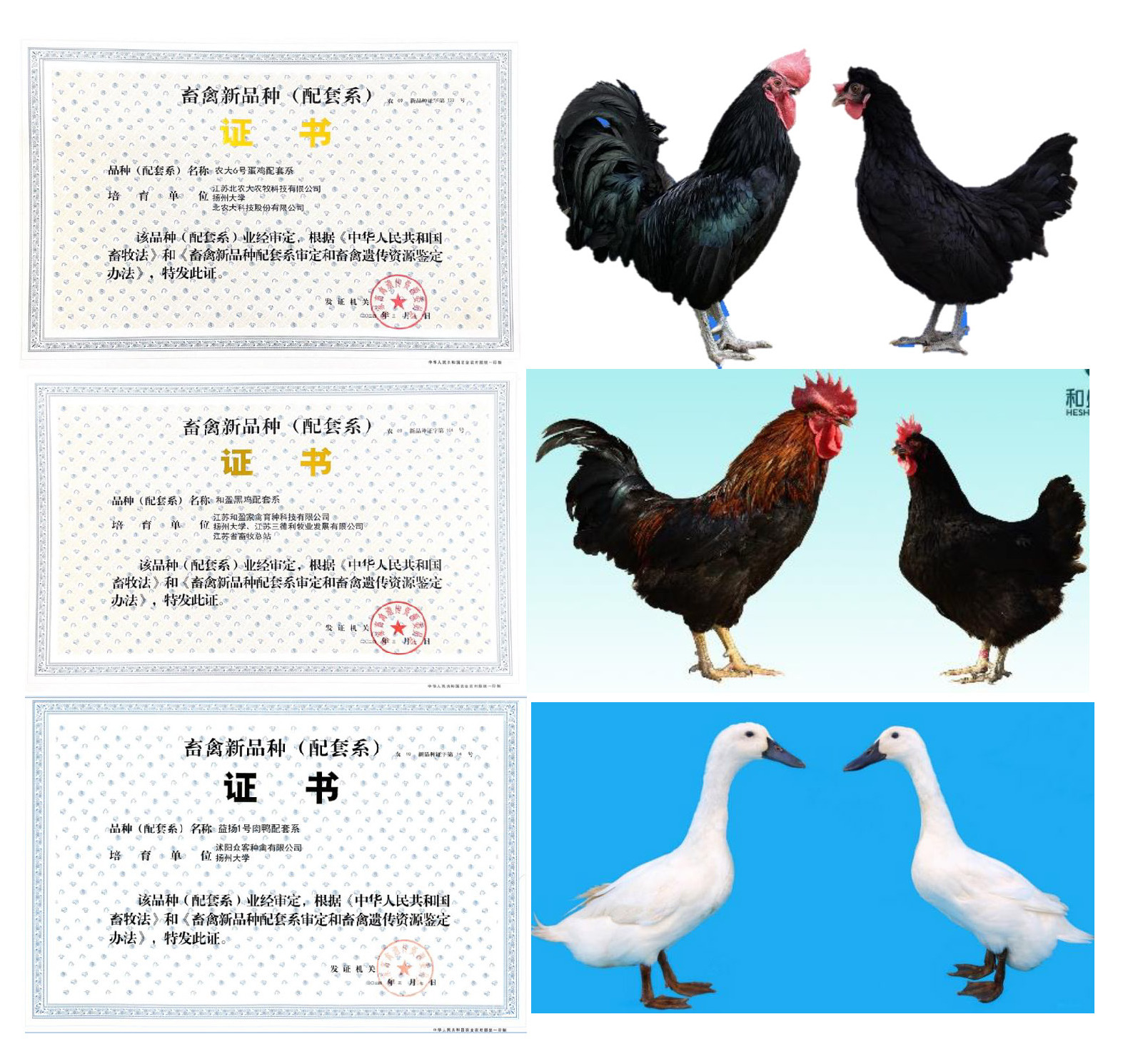 “农大6号”商品鸡具有“生产性能好、成活率高、蛋壳质量好、油亮有光泽、淘汰鸡价格高、饲料报酬高”的突出优势,是具有“两高一低”市场定位的高产优质特色蛋鸡配套系。“和盈黑鸡配套系”是国内第一个利用隐性白羽鸡早期长速快、体形健硕的特点导入A系和B系黑鸡成功培育而成,父母代66周龄饲养日产蛋数高达208.4个,商品代群体均匀度好、抗逆性强、饲养经济效益显著、肉品质好、适应性强,且不改变消费者喜爱的商品代以黑色为主的外貌特征。“益扬1号肉鸭配套系”具有生长速度适中、饲料转化率高、抗逆性强、肉品质好的乌喙、白羽、青脚的特点,商品代肉鸭上市日龄49天左右,上市体重约2.2kg,饲料转化率低于2.5:1,屠体光洁适合屠宰加工盐水鸭、卤鸭、酱鸭、板鸭和鸭煲等传统特色产品。