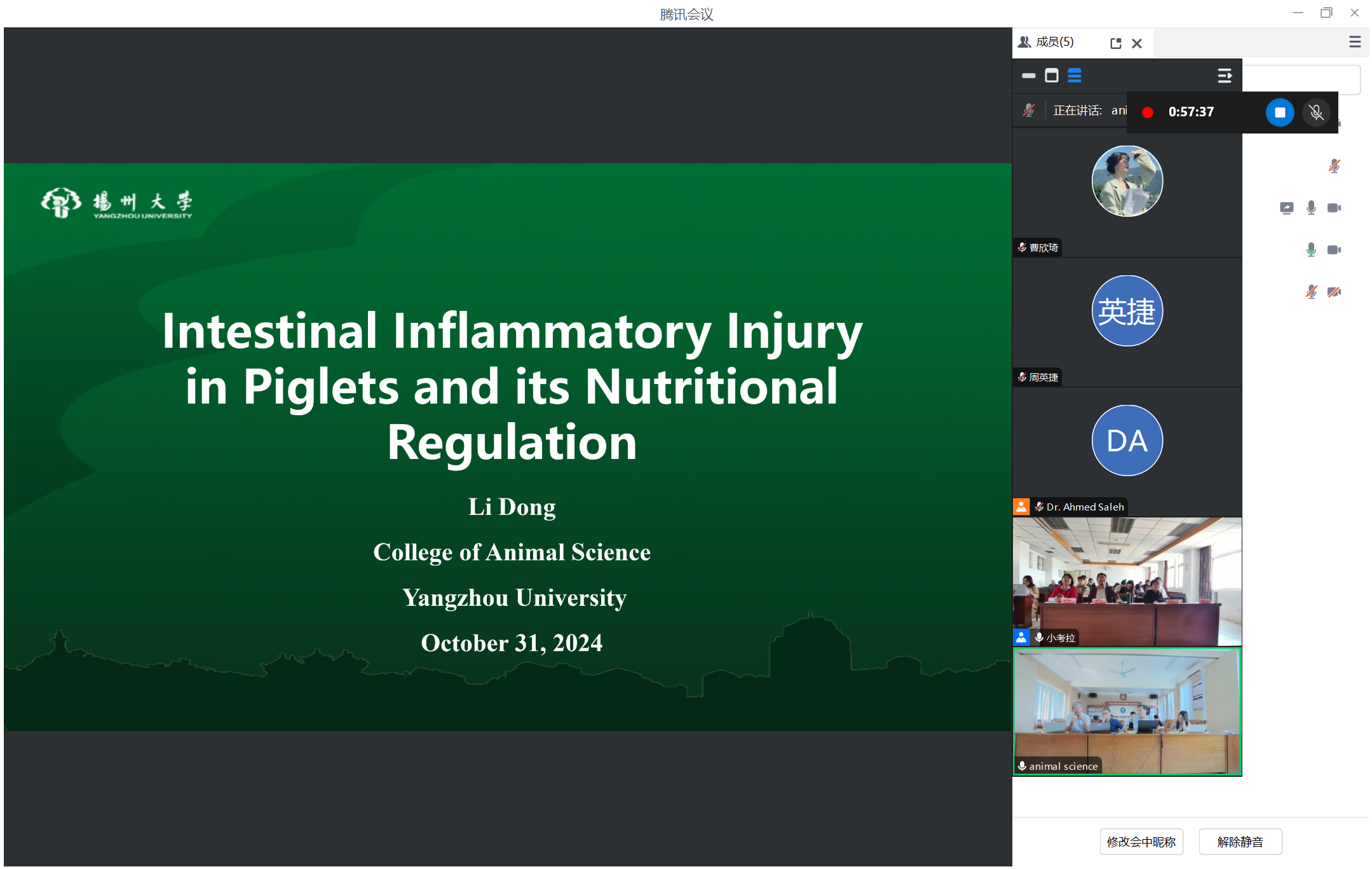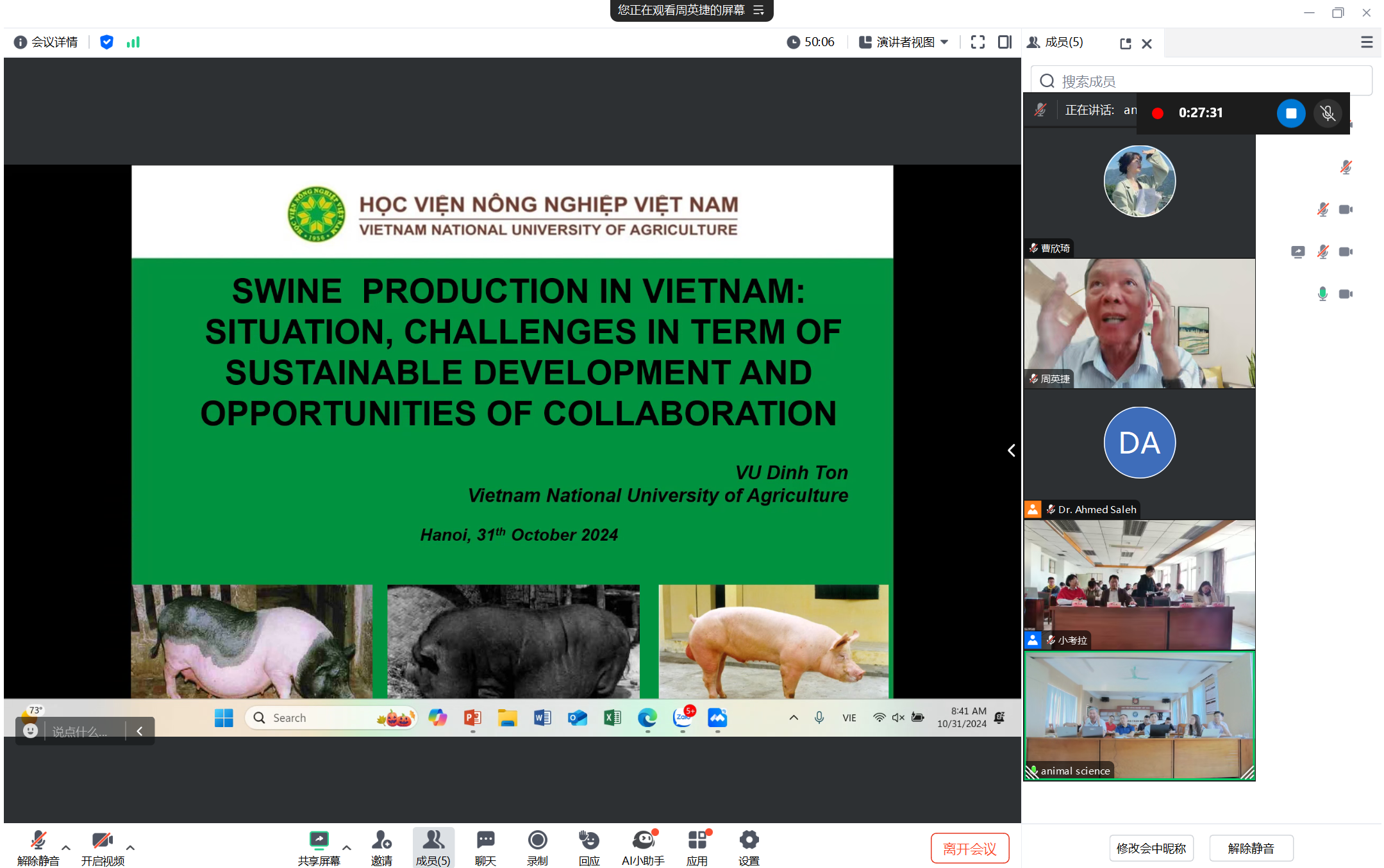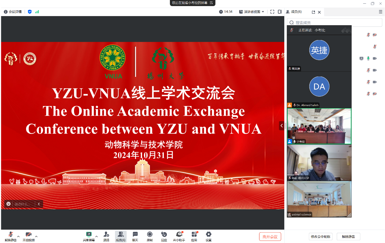 10月31日上午,学院与越南国立农业大学动科院举办“一带一路”畜牧学线上+线下学术交流研讨会。扬州大学国际合作与交流处处长张吟、越南国立农业大学科技处处长Tran Hiep、越南国立农业大学动科院系主任Nguyễn Hoàng Thịnh、扬州大学动物科学与技术学院李碧春教授、宋成义教授及双方畜牧学领域专家和部分研究生共50余人参加会议。
