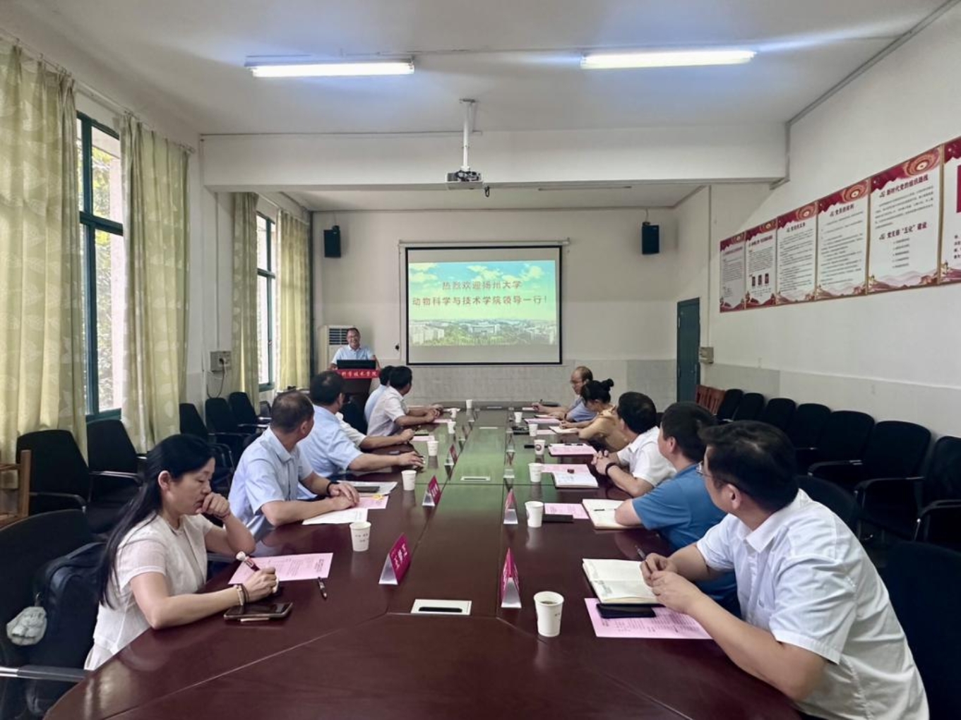 8 月 14 日,扬州大学动物科学与技术学院党委书记刘春秋、院长常国斌率学院领导班子成员前往湖南农业大学动物科学技术学院开展调研交流活动。湖南农业大学动物科学技术学院院长贺喜、党委书记祖智波、正处级专职组织员徐琳、副院长何俊、党委副书记周军铁、副院长范志勇等热情接待并参加座谈,会议由祖智波主持。