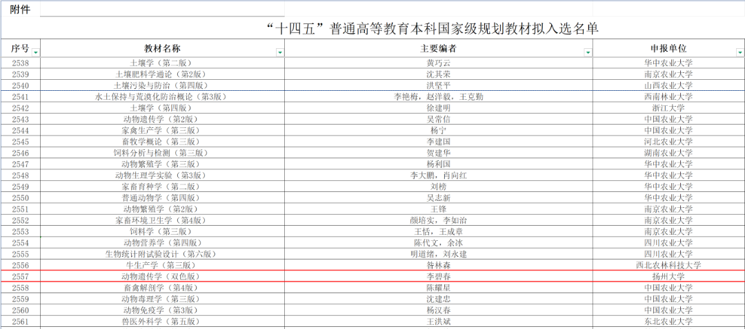 近日,教育部发布关于“十四五”普通高等教育本科国家级规划教材拟入选名单的公示:根据《“十四五”普通高等教育本科国家级规划教材建设实施方案》(教高厅〔2023〕1号)和《教育部办公厅关于开展“十四五”普通高等教育本科国家级规划教材第一次推荐遴选工作的通知》(教高厅函〔2024〕9号)的有关要求,经有关部门(单位)教育司(局)、各省级教育行政部门和高校推荐申报,教育部组织评审,我院李碧春教授主编《动物遗传学》(双色版)教材成功入选!