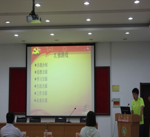 首先,由范吉标老师为大家介绍了本次答辩的具体流程、要求及注意事项,并介绍答辩人的个人情况。本次的答辩活动分两部分进行,第一个环节是积极分子们上台进行自我介绍,结合PPT展示自我风采。在这一环节中,发展对象主要阐明自己的入党动机,从思想上、学习上和生活上介绍自己的基本情况,并指出自己的优点和不足。随后评委们根据个人对发展对象的汇报情况对发展对象提出建议和指导,积极地帮助发展对象了解自己本身的不足,并就社会的时政热点提出问题。答辩结束后,由王婧怡算得平均分并上报。