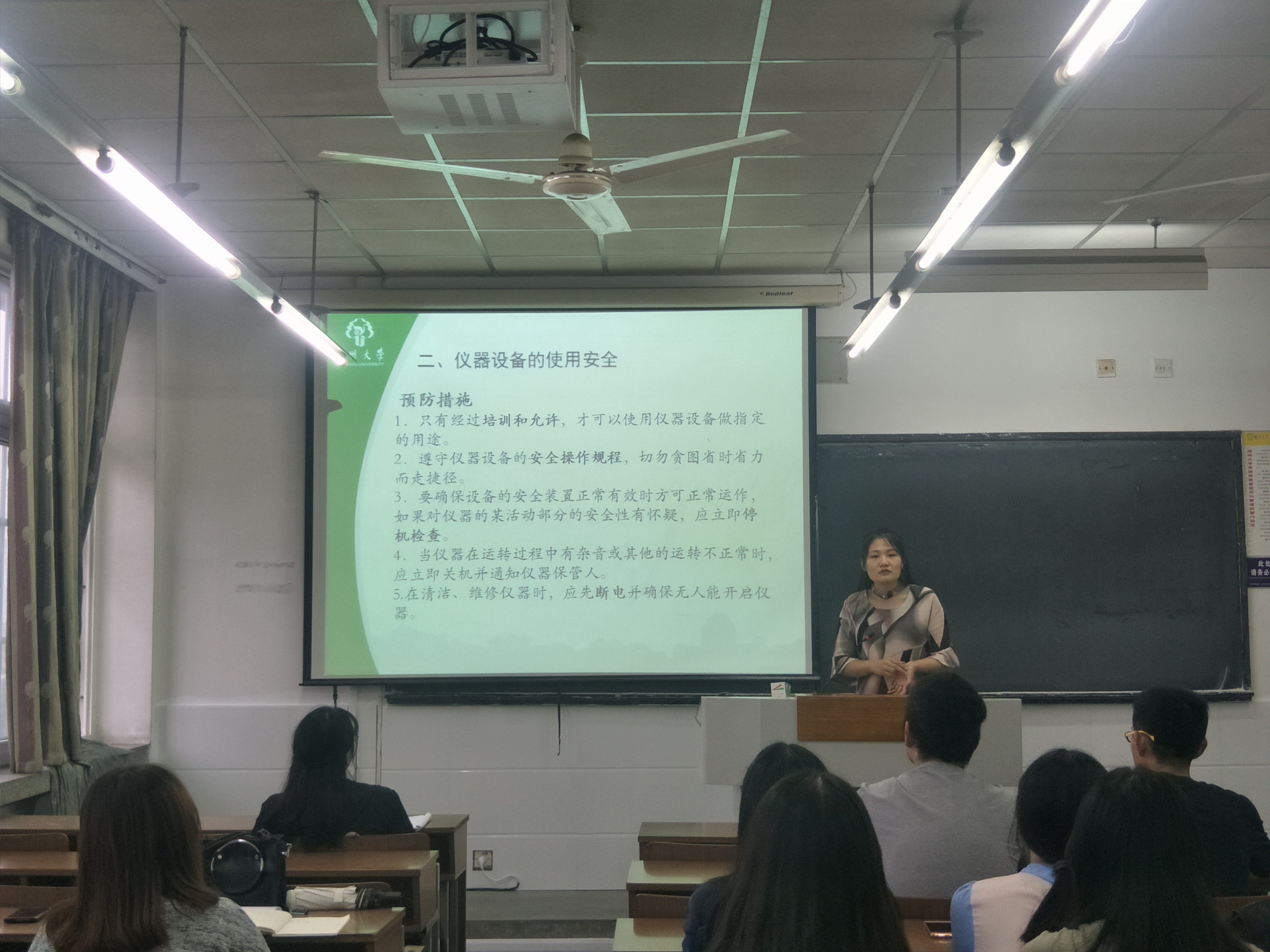 此次讲座主要包含实验室须知、仪器设备及化学剧毒药品的使用安全、实验室试剂的采购流程和标签规范等方面。其中,院研会主席王梦琦讲到参加实验时不能穿拖鞋和短裤,操作要规范,须戴手套;学会做好安全检查工作;不准在实验室、库房及资料室抽烟;保持实验室整洁及熟悉逃离路线和紧急疏散方法。而在仪器设备和化学剧毒药品的使用中,要严格按照操作流程,注意安全使用。同时作为一名研究生,要学会给试剂贴标签和对其进行合理采购。最后,李怡老师总结了本次讲座的重点:实验室安全无小事。强调研究生进入实验室必须认真学习各项操作,将安全放在第一位。