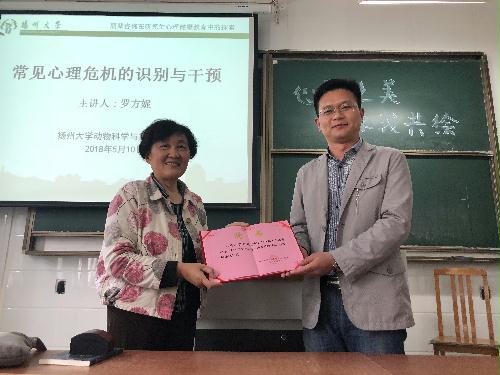 关工委罗方妮老师就大学生心理危机的识别与应对作了专题讲座,举了多个例子生动形象地教育同学们如何理解并帮助有心理危机的同学,特别是共情这一沟通技巧。李怡老师也与大家分享了处理此类问题的方法与建议,第一时间找到校内外资源及时求助,最后由王小龙老师对此次讲座作总结并为罗方妮老师颁发“动科情怀课外辅导员”心理辅导员的聘书。