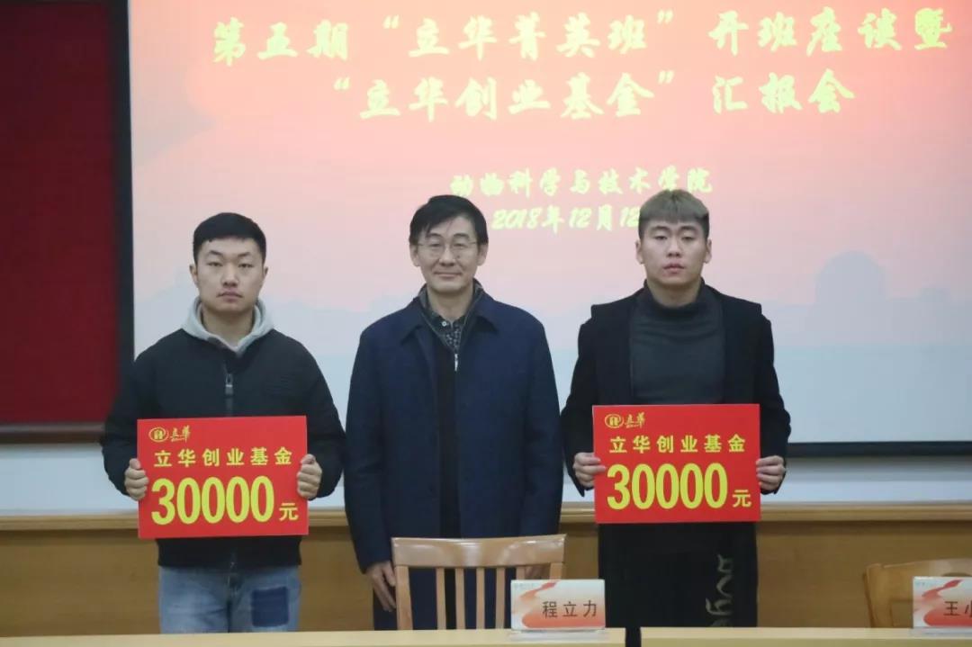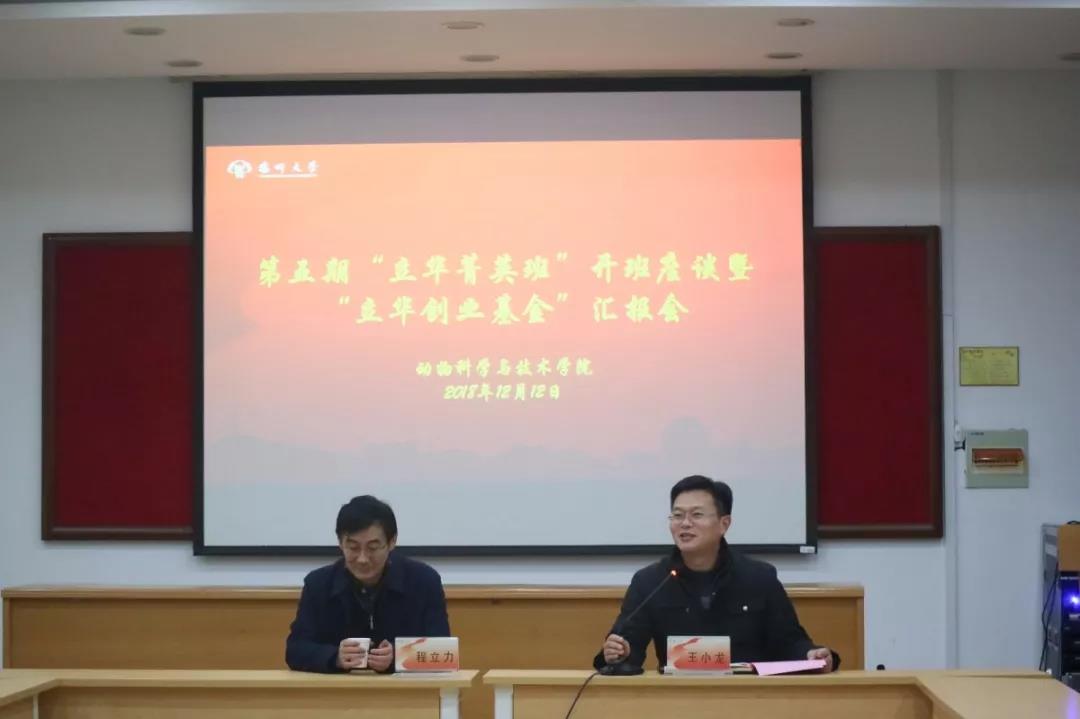 12月12日下午,我院于立华报告厅举行第五期“立华菁英班”开班座谈暨“立华创业基金”汇报会。江苏立华牧业股份有限公司董事长、总裁程立力先生,团委、学工办老师以及第三、第四期“立华创业基金”学生代表和第五期“立华菁英班”全体成员参与本次活动。院党委副书记王小龙主持本次活动。