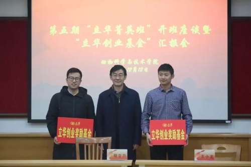 首先进行第三、第四期“立华创业基金”汇报,张志鹏等4位同学先后汇报各自创业项目,程立力先后为张志鹏、吴森同学颁发“立华创业奖励基金”,授予陈代杰、邓哲宇同学“立华创业基金”。