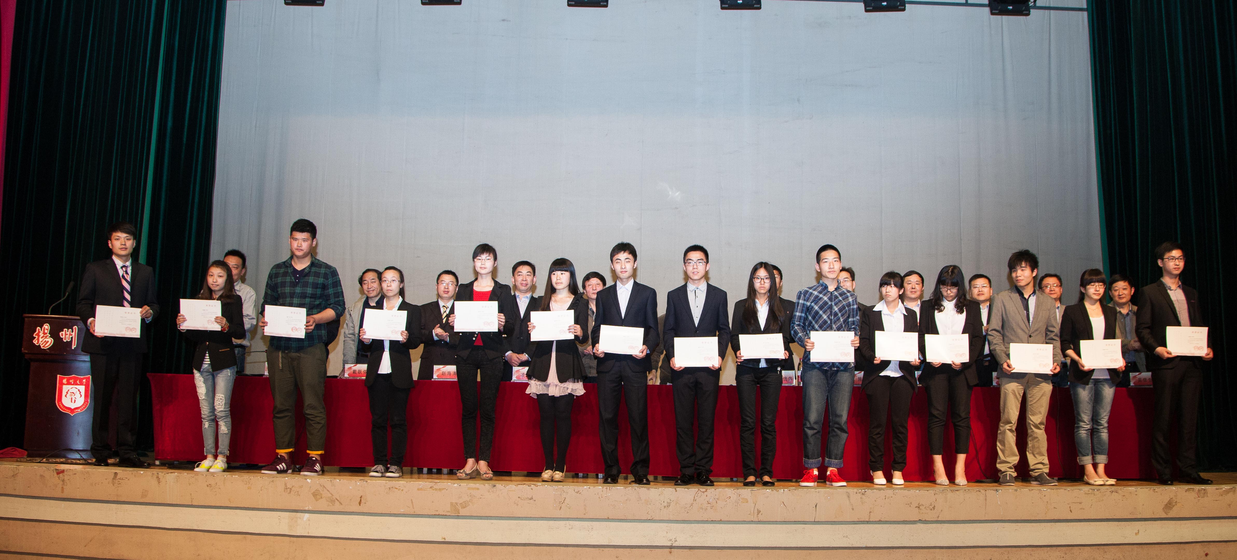 今年受表彰的有2013年度国家奖学金获得者、扬州大学“校园先锋”、科研成果获得者、2014届考研中取得最高分以及英语四六级成绩优异的学生等一批表现优秀的个人。必修课考试通过率100%的非毕业班动科1101班、水产1101班,国家英语四级一次通过率最高的草业1301班等集体也获得了表彰。