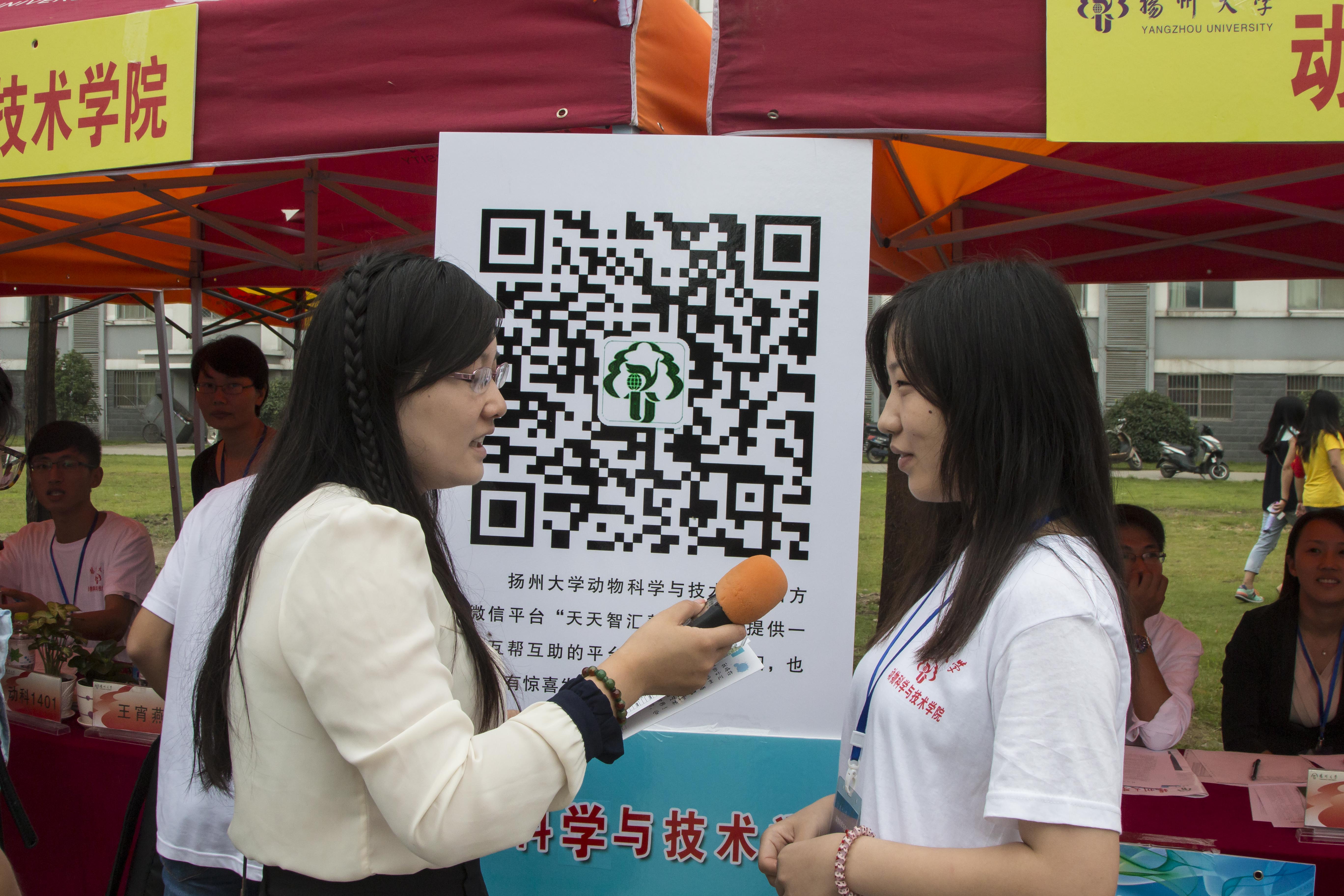 新生们陆陆续续地踏进了扬大这一新的起点,文汇路校区里到处都是老生们在迎接新生的身影。记者在留学生草坪处看到许多学院在这儿设立了迎新点。今年,动科学院设置了醒目的迎新标牌,它是一只昂首阔步,健壮俊美的马。棕色的马身上印着8个字,“跃马动科,弘毅致远”。每位新生都可以在这里和家长留影,留下自己刚进校园时最初的足迹。当问及这八个字的含义的时候,动科学院团委老师表示,“这不仅体现了我们动科院的特色,也代表着动科学子的龙马精神,希望这一届的马年新生们可以在动科院这个舞台上策马奔腾,马到成功。”同时,为了方便新生及时了解学院动态,今年动科学院特别设置了“天天智汇帮”微信公共平台,新生们只要使用“扫一扫”功能刷新二维码,就能关注动科学院公共微信,从而得到有关学院工作、活动的各项消息通知。