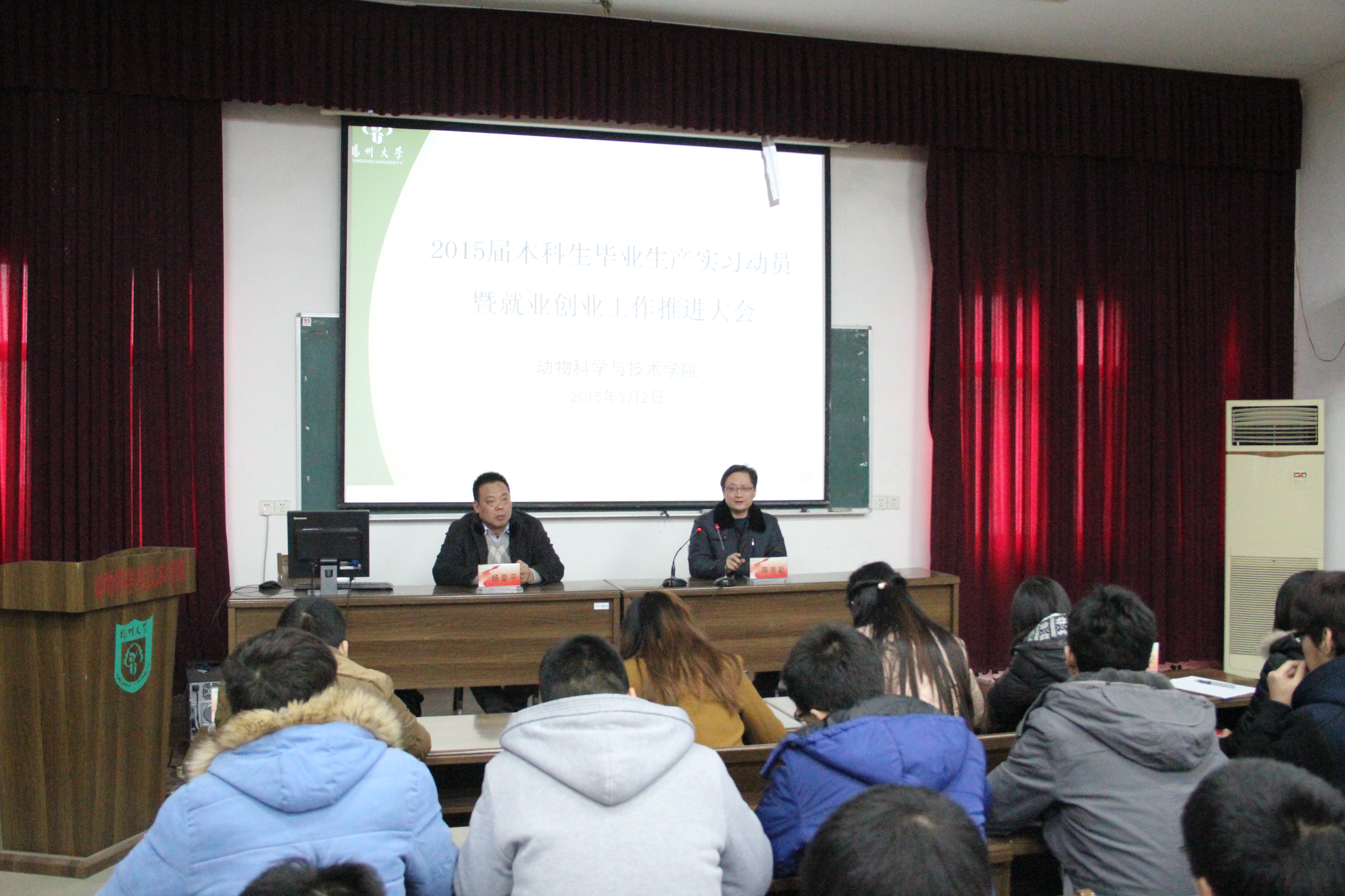3月2日下午,我院在推广楼学术报告厅召开2015届毕业生生产实习动员暨就业创业推进大会,通报毕业生生产实习工作的相关规定并提出具体要求。杨章平副院长主持会议,院党委陈克勤副书记出席会议并讲话,毕业班班主任老师、院团委学工办老师及2015届全体毕业生参加了会议。