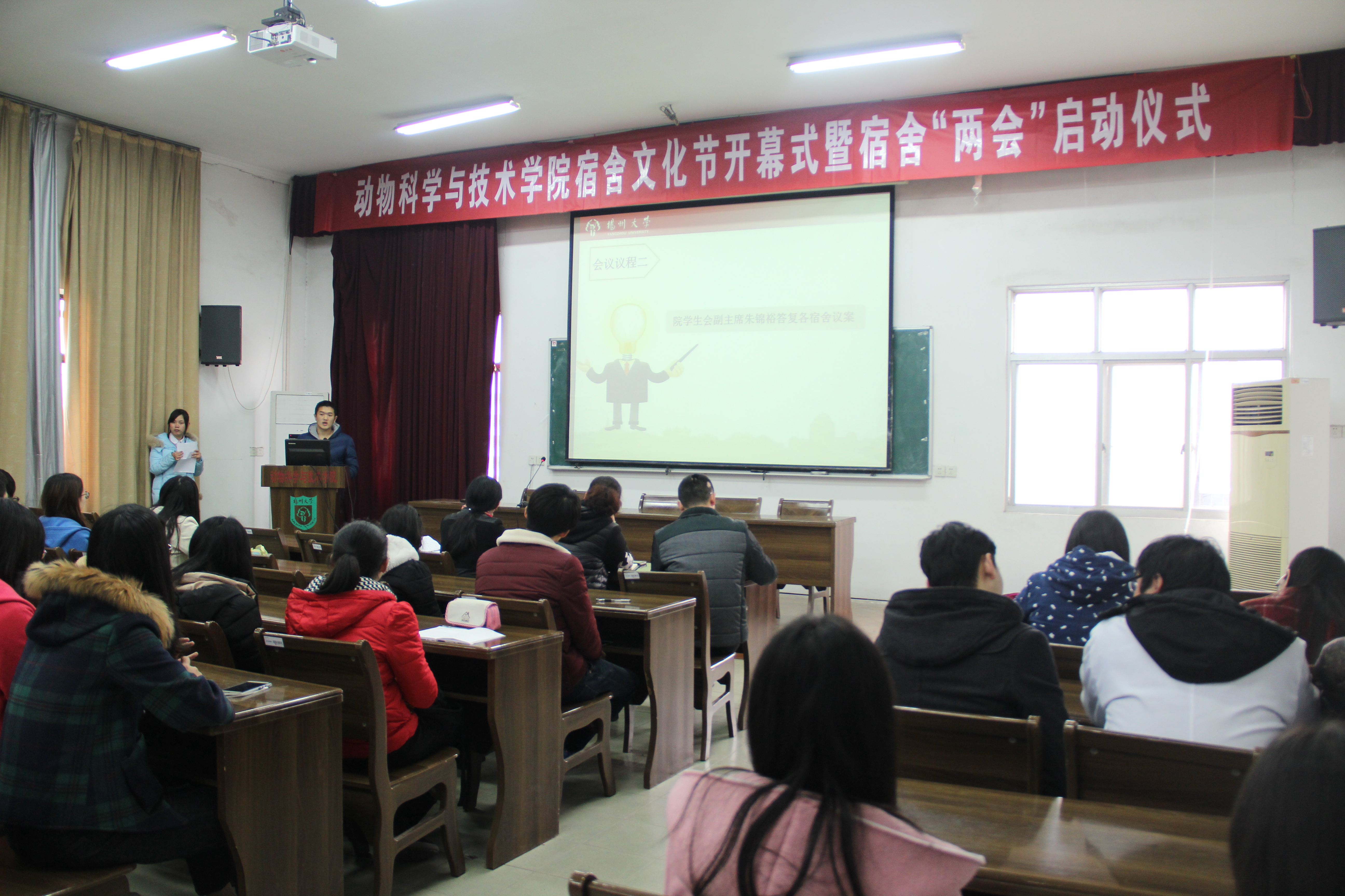 3月17日,动科学院在文汇路校区推广楼学术报告厅举行宿舍文化节开幕式暨宿舍“两会”启动仪式。校区宿舍管理办主任张媛媛与院党委副书记张彦先后致辞,期间朱锦裕代表学生会答复宿舍建设议案。