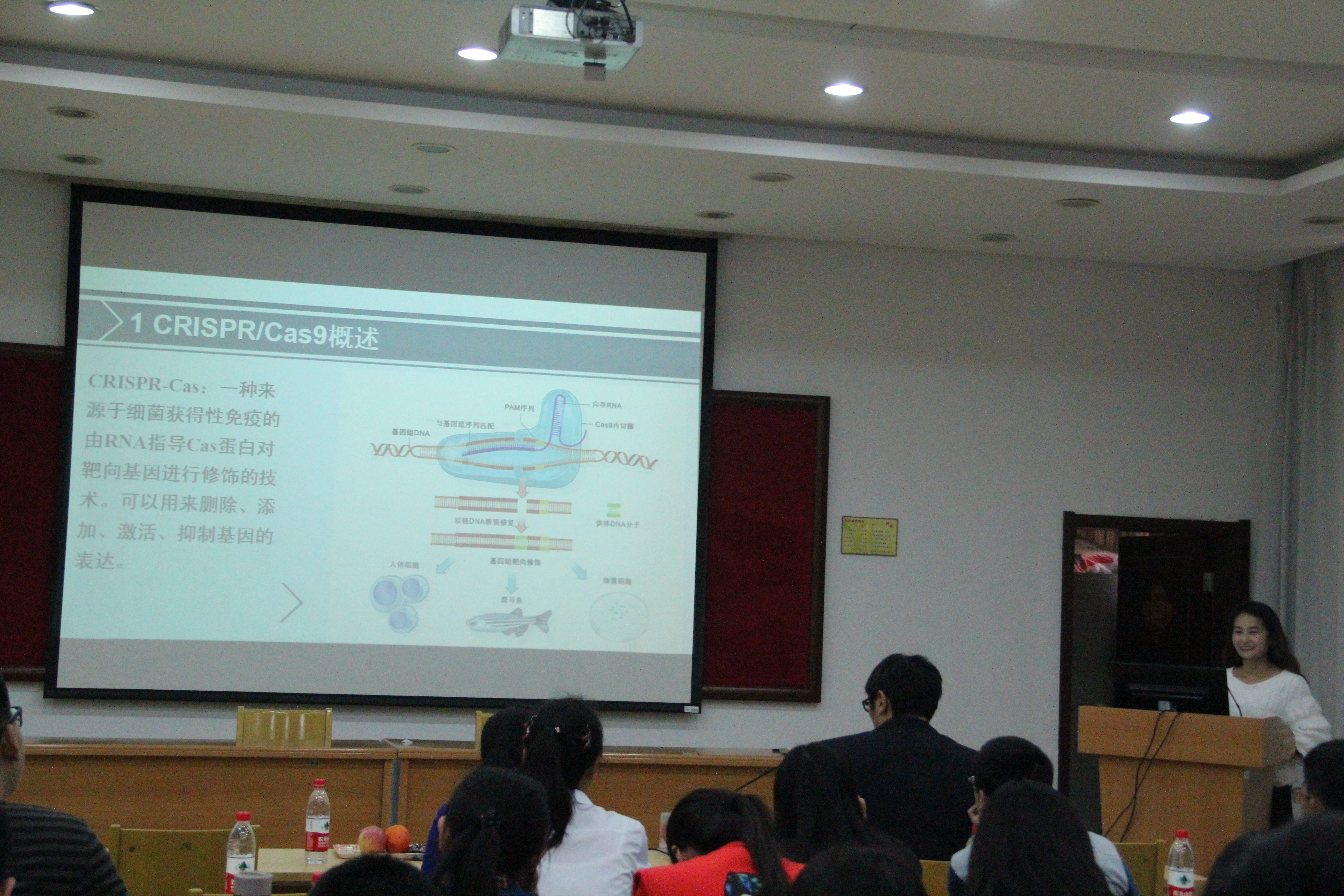 本次交流会的研讨方向包括遗传、营养等,内容丰富,形式多样,既有科学技术等综述性的研究进展报告,也有实验方法结果的分析讨论,还有汇报人对学科对专业的看法和思考。首先,14级研究生韩笑同学讲述了CRISPR/Cas9介导的基因组定点编辑技术的研究进展,“这种技术能够对人和动物的基因组进行人为修饰和编辑改造”,引得全场的本科生惊叹;14级研究生程国虎同学汇报的胚胎移植技术等也引起低年级同学的浓厚兴趣。高年级研究生的汇报有板有眼,低年级研究生也毫不逊色,15级研究生赵凤至、赵悦、陈晓帅、刘慧军、魏涛和王波等6位同学对自己正在进行的科研实验进行了详实的汇报,为大家展示了畜牧专业行情和发展趋势。两位评委老师的精彩点评和全场活跃的互动讨论将此次学术交流会推向高潮