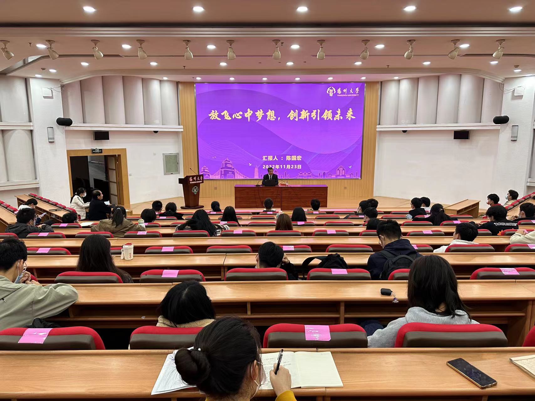 11月23日下午,动科学院工会、团委在逸夫图书馆报告厅联合举行劳模精神进校园系列活动,邀请江苏省五一劳动奖章获得者、动物科学与技术学院陈国宏教授担任主讲人,给2022级动物科学、草业科学、水产养殖专业158名在校同学进行宣讲。